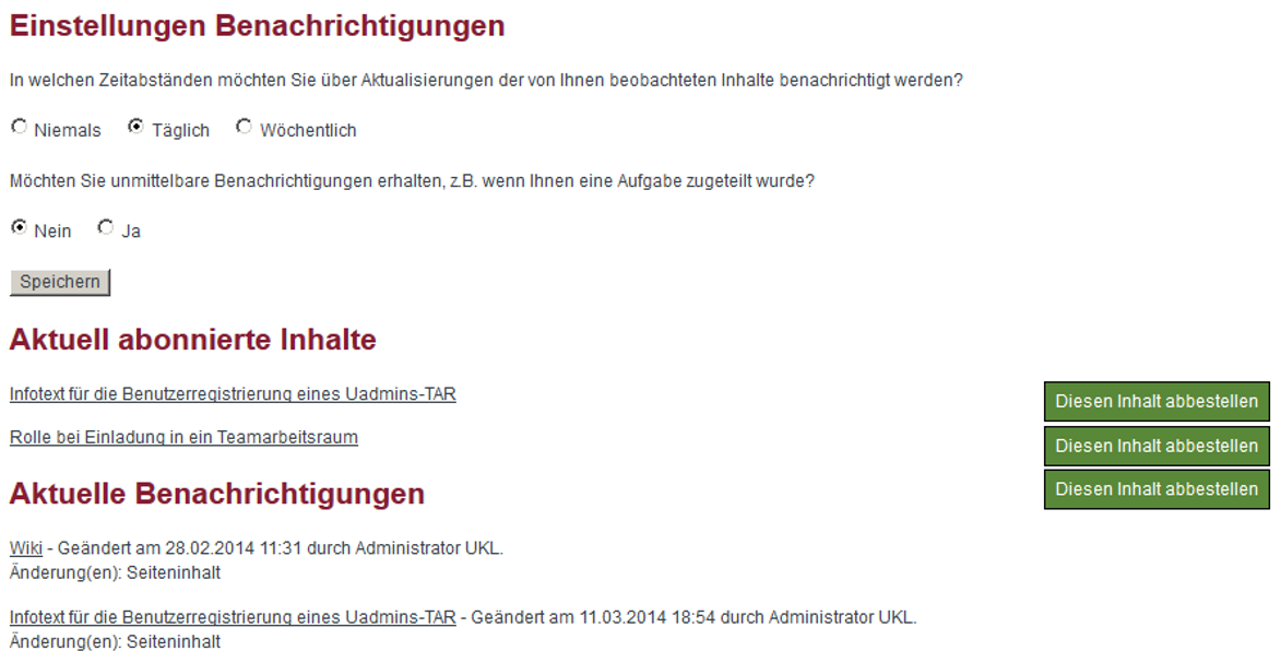 Eine Übersicht der abonnierten Inhalte (siehe Abbildung Abonnierte Inhalte) wird unter Menüpunkt "Abonnierte Inhalte" (siehe Abbildung Inhalt abonnieren, Punkt 2) angezeigt. Durch Anklicken des Knopfs Diesen Inhalt abbestellen (siehe Abbildung Abonnierte Inhalte) können im Bereich Aktuell abonnierte Inhalte bereits abonnierte Inhalte einzelne abbestellt werden.