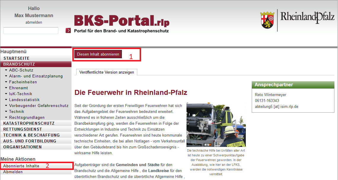 Generell können die gewünschten Inhalte von jedem angemeldeten Nutzer abonniert werden, indem die Schaltfläche Diesen Inhalt abonnieren betätigt wird (siehe Abbildung Inhalt abonnieren, Punkt 1).