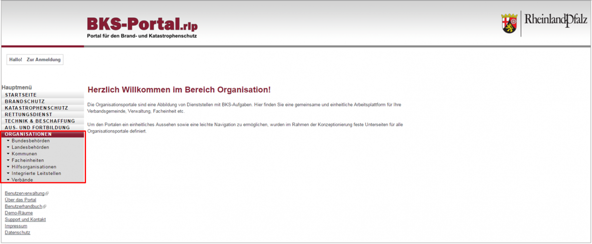 Um den Dienststellen mit BKS-Aufgaben eine gemeinsame und einheitliche Arbeitsplattform zu bieten, werden diese in Form von Organisationsportalen im BKS-Portal.rlp unter dem Menüpunkt „Organisationen“ abgebildet. Die Organisationsportale beinhalten neben definierten Unterseiten mit festen Inhalten die Möglichkeit, weitere Informationen und Inhalte auf individuellen Seiten zu publizieren. Somit wird eine Plattform für zentrales und kollaboratives Arbeiten geboten. Allen Seiten in einem Organisationsportal sollen, wie auch im Wissensmanagement, Ansprechpartnern zugeordnet werden, die für Aktualisierungen oder Rückfragen von Nutzern der Seiten zuständig sind.