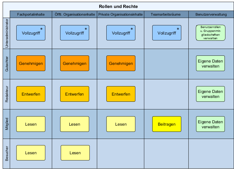 Der Besucher hat ausschließlich Leserechte in allen Fachportalen und den öffentlichen Teilen der Organisationsportale. Das bedeutet, dass sie Inhalte zwar sehen, aber nicht bearbeiten können.