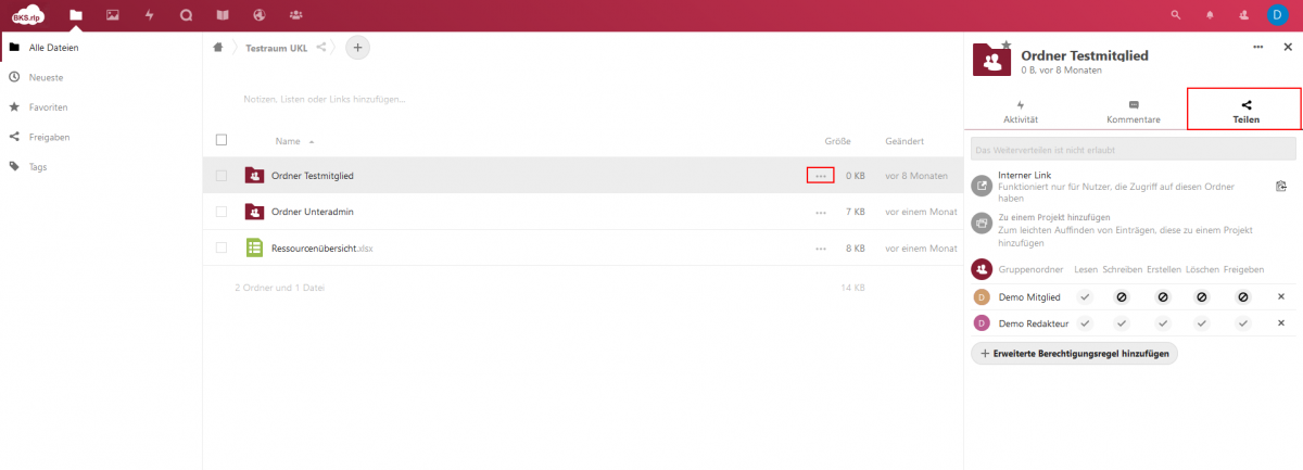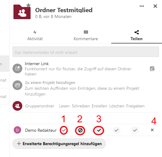 Ist die Funktion für den Gruppenordner aktiviert, kann das Kontextmenü ("...") geöffnet werden und im Reiter "Teilen" können für jeden Nutzer separate Berechtigungen verwaltet werden. Dabei muss nicht gleich für jeden Nutzer eine solche Regel angelegt werden, sondern nur für diese, die eben spezielle Berechtigungen (bspw. nur Leseberechtigungen) bekommen sollen. Die Regeln bilden daher sozusagen Ausnahmen ab.