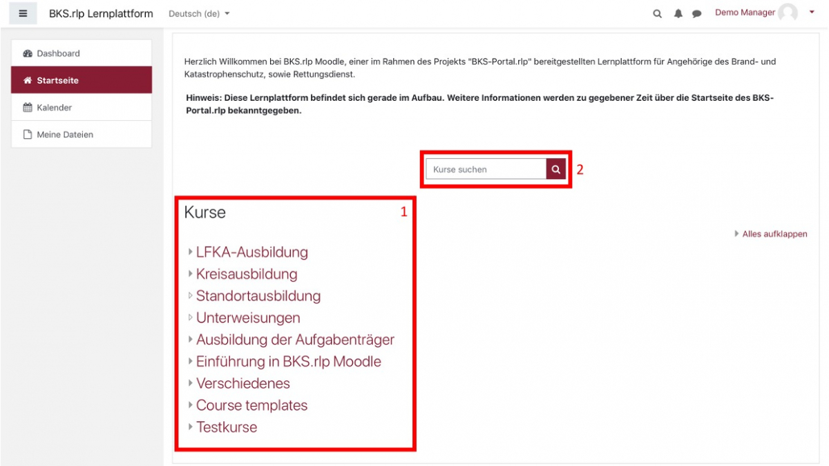 Auf der Startseite sind die verschiedenen Kursbereiche der Lernplattform aufgelistet. In den Kursbereichen finden Sie die verschiedenen Kurse. Kurse können Sie auch über die Suche (2) suchen.