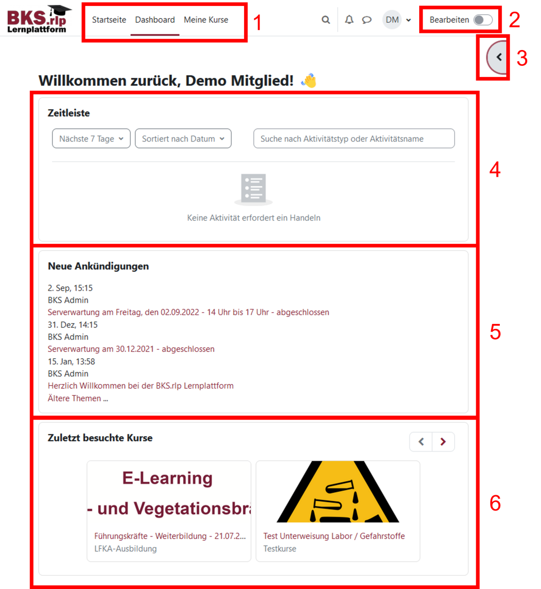 Der mittlere Bereich ist in Standardeinstellung untergliedert in 3 Bereiche. Oben werden Ihnen Aktivitäten angezeigt, die Ihr Handeln erfordern (4). In der Mitte werden sehen Sie die neuesten Ankündigungen (5) und im unteren Bereich werden Ihre zuletzt besuchten Kurse angezeigt (6). Über die Schaltfläche "Bearbeiten" (2) können Sie Ihr Dashboard individuell anpassen.