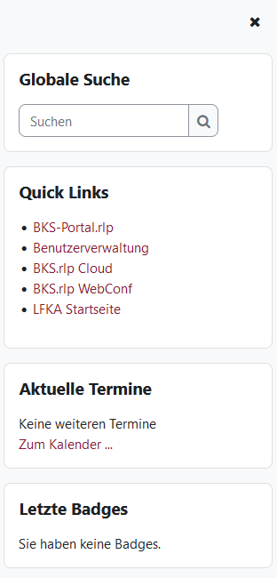 Dort finden Sie noch die globale Suche, Quicklinks zum BKS-Portal.rlp, zur Benutzerverwaltung, zur BKS.rlp Cloud, zur WebConf Raumreservierung und der Startseite der LFKA, eine Übersicht Ihrer aktuellen Termine und abschließend noch Ihre Badges, die Sie sich durch Aktivität auf der BKS.rlp Lernplattform verdienen können.
