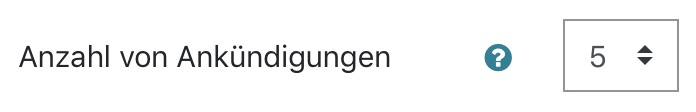 Das Ankündigungsforum ist ein spezielles Forum, welches automatisch im Kurs erstellt wird, automatisch abonniert ist und in dem nur Nutzer/innen mit speziellen Rechten (Trainer/innen) Ankündigungen schreiben dürfen. Diese Option legt fest, wie viele Ankündigungen im Block "Neue Ankündigungen" angezeigt werden. Falls ein Ankündigungsforum im Kurs nicht benötigt wird, sollte die Einstellung auf 0 gesetzt werden. |