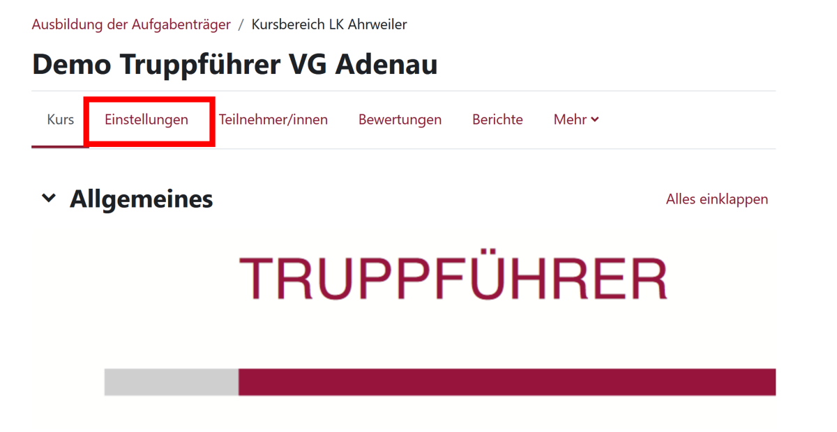 Wenn Sie die Einstellungen für Ihren Kurs nachträglich ändern möchten, können Sie dies mit Klick auf den Link "Einstellungen" tun.