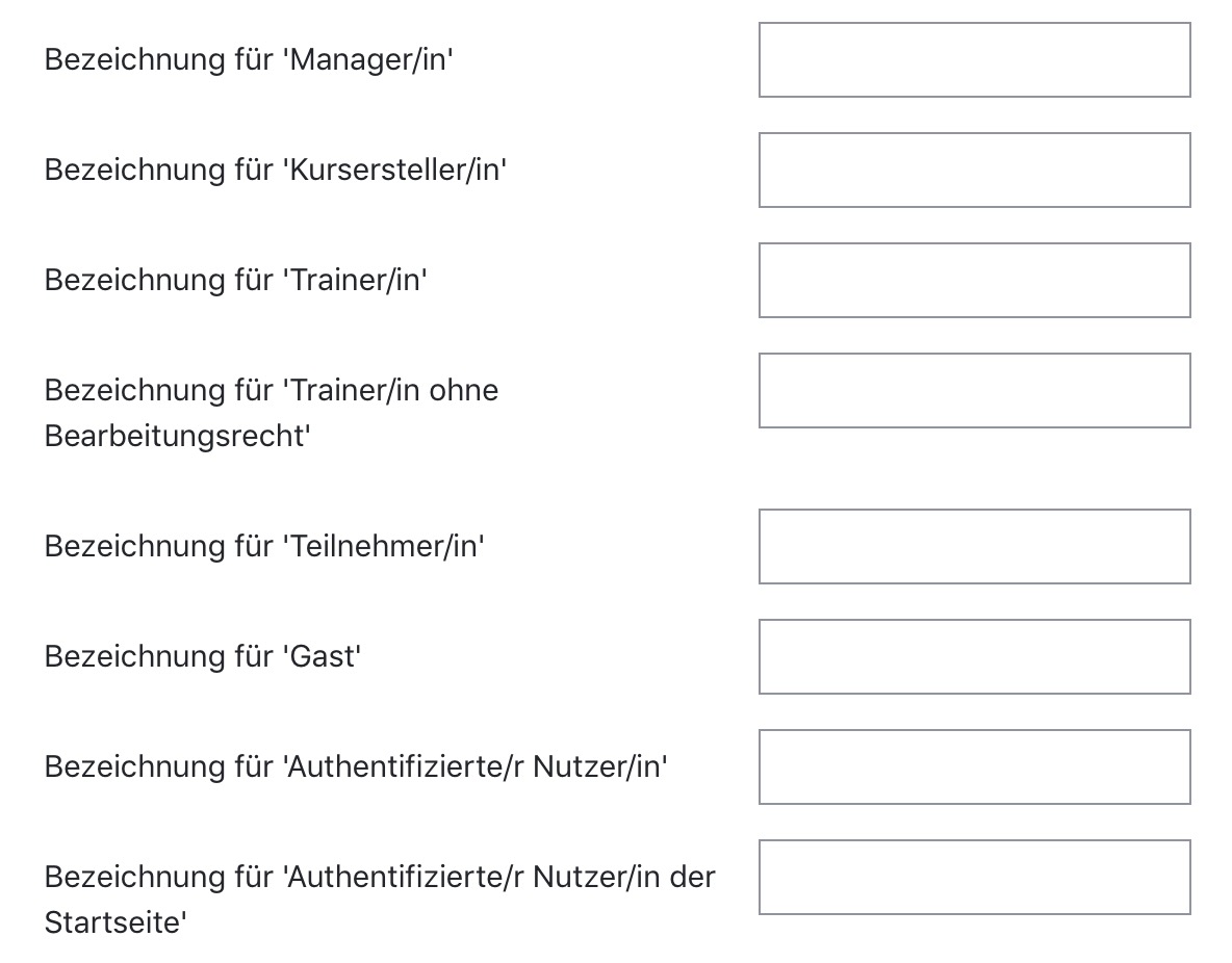 Mit dieser Option können die Namen der Rollen in Ihrem Kurs umbenannt werden. Wenn Sie z.B. Trainer/in in Dozent/in für den aktuellen Kurs umbenennen wollen, tragen Sie dies hier ein. Die Rollenberechtigungen werden durch das Umbenennen nicht verändert. Die geänderten Rollenbezeichnungen sind in der Nutzerliste und an anderen Stellen des Kurses zu sehen. Ist die umbenannte Rolle eine Kursverwalterrolle, dann wird der neue Rollenname ebenso in der Kursliste angezeigt. |