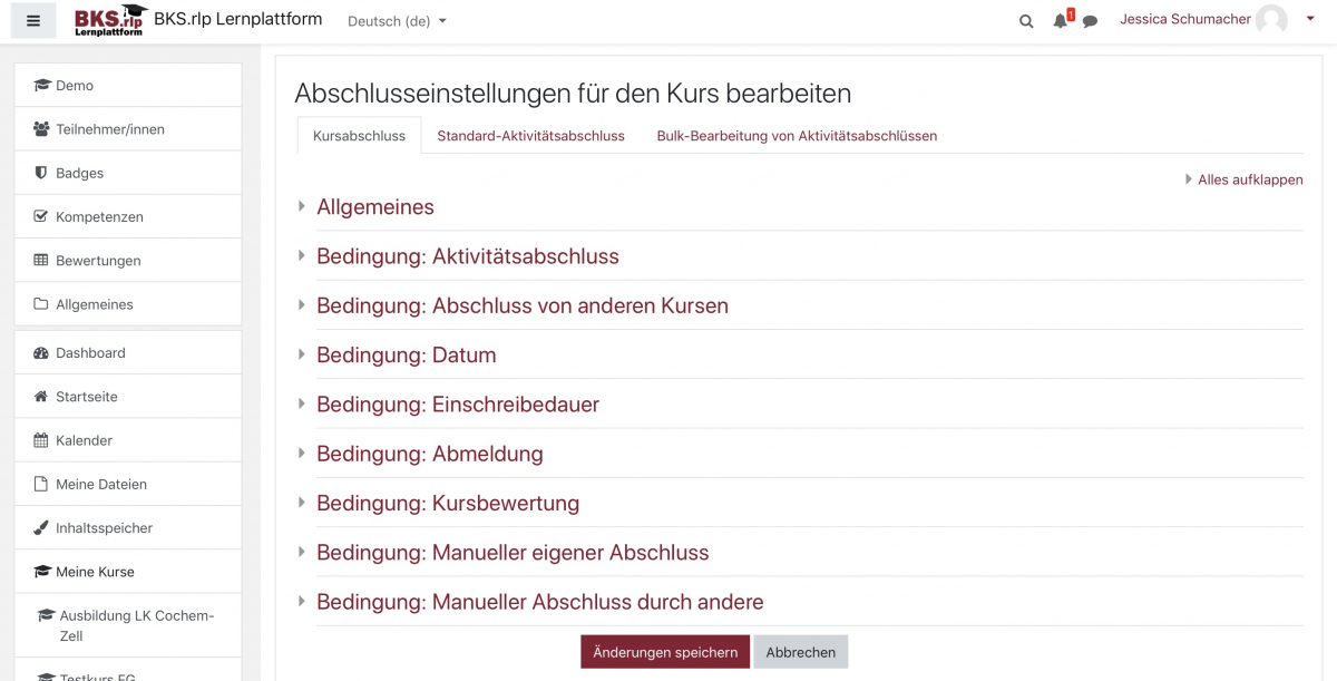 Dort können Sie verschiedene Bedingungen für den Kursabschluss einstellen.