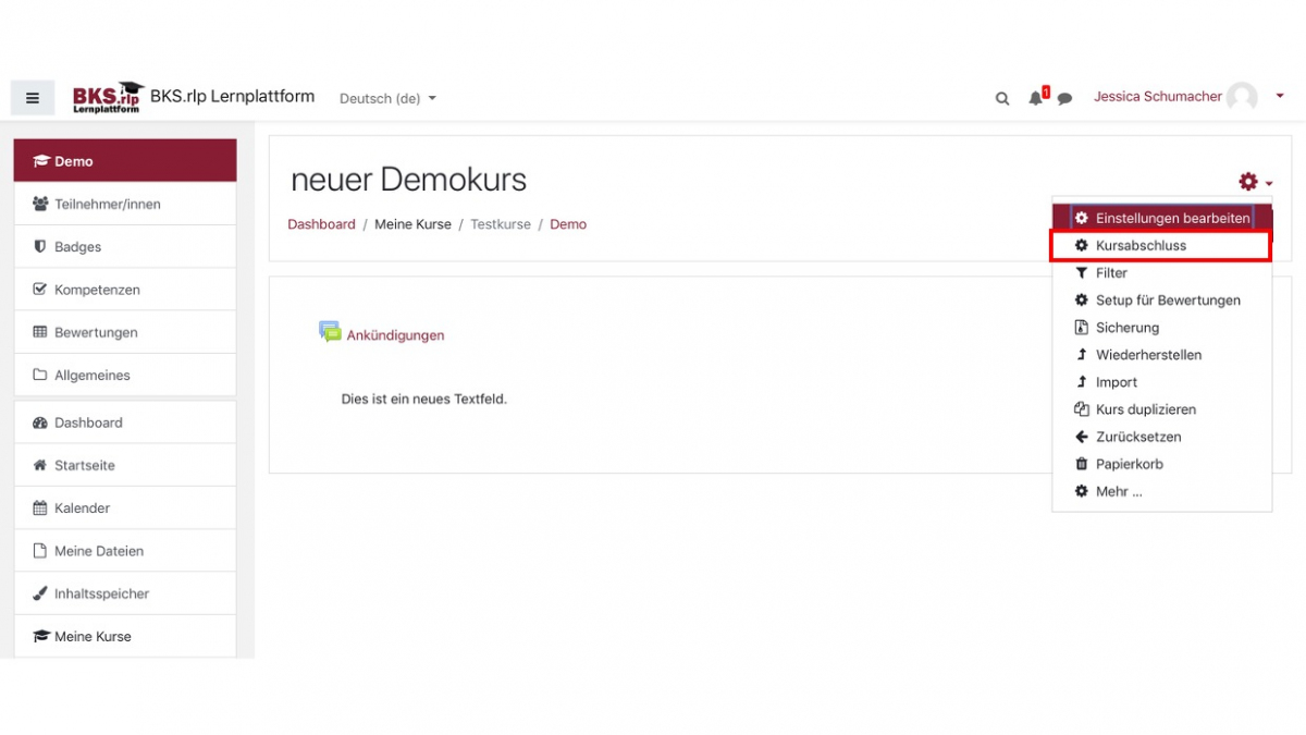 Nach Klick auf den Menüpunkt "Kursabschluss" öffnet sich ein neues Menü.