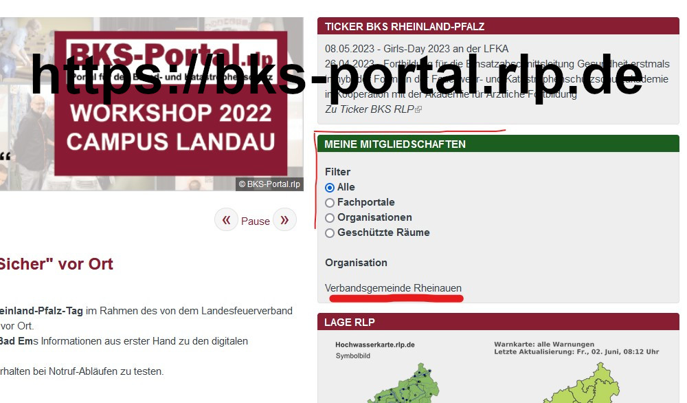 Indikator 2 für den Nutzer: Nach der Anmeldung im BKS-Portal.rlp erscheint auf der Startseite rechts im Block "Meine Mitgliedschaften" der Aufgabenträger / die VG.