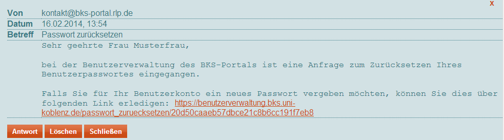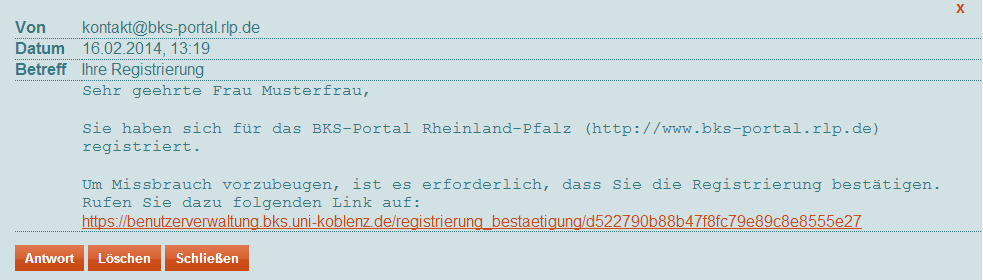Damit das vorläufig angelegte Benutzerkonto endgültig aktiviert wird, muss der in der E-Mail befindliche Bestätigungslink aufgerufen werden.