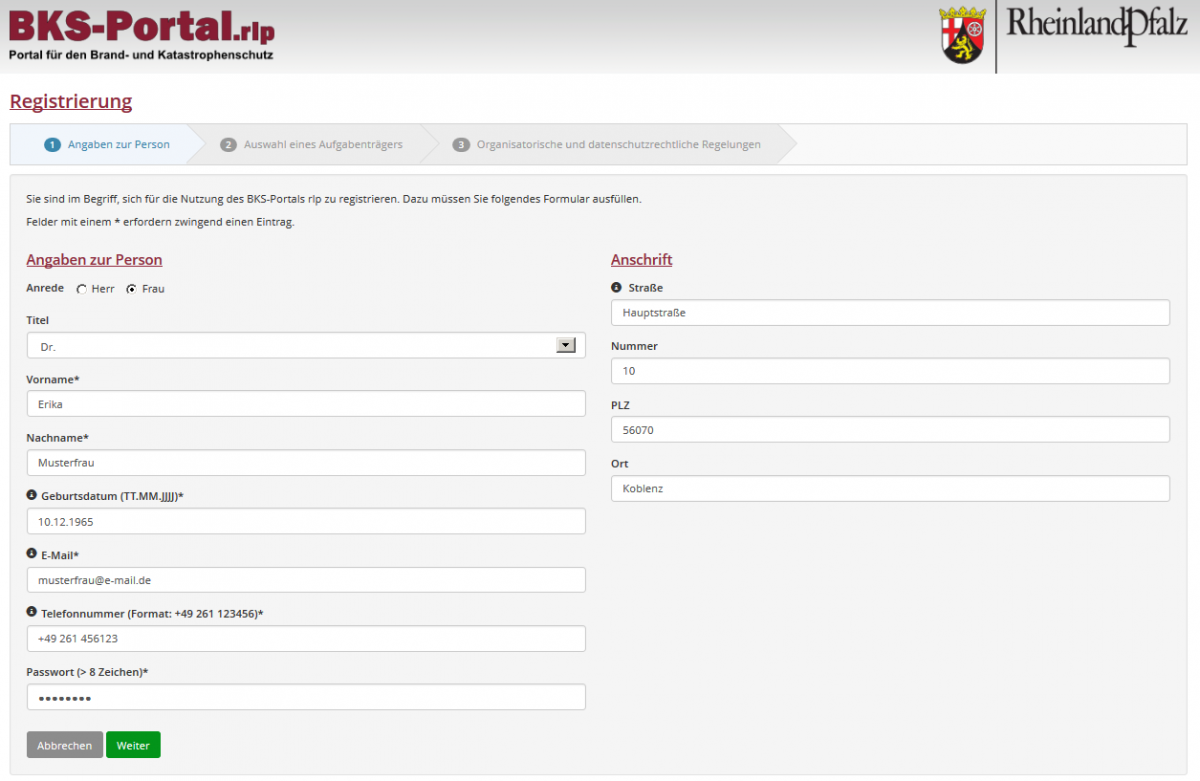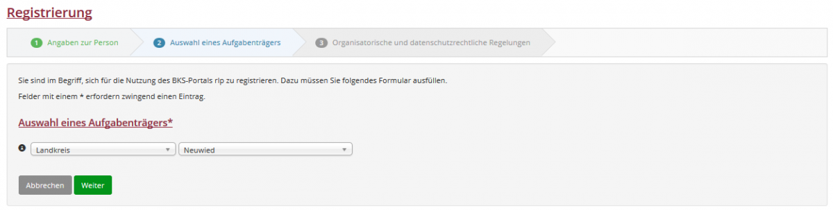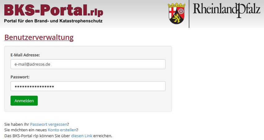 Um das BKS-Portal.rlp im vollen Umfang nutzen zu können, ist eine einmalige Registrierung des Benutzers erforderlich. Dazu wird auf der Startseite der Zur Anmeldung-Link angeklickt. Der Benutzer wird auf die Anmeldeseite geleitet, wo er als nächstes den Link Jetzt registrieren anklicken soll. Nach dem Anklicken des Links wird die Registrierungsseite angezeigt, auf der folgende persönliche Angaben zu machen sind: