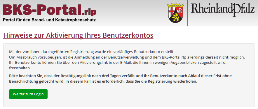 Hinweis: Die Bestätigung der E-Mail Adresse soll innerhalb von 3 Tagen erfolgen, da ansonsten die Registrierungsanfrage verfällt. In diesem Fall muss die Registrierung wiederholt werden.