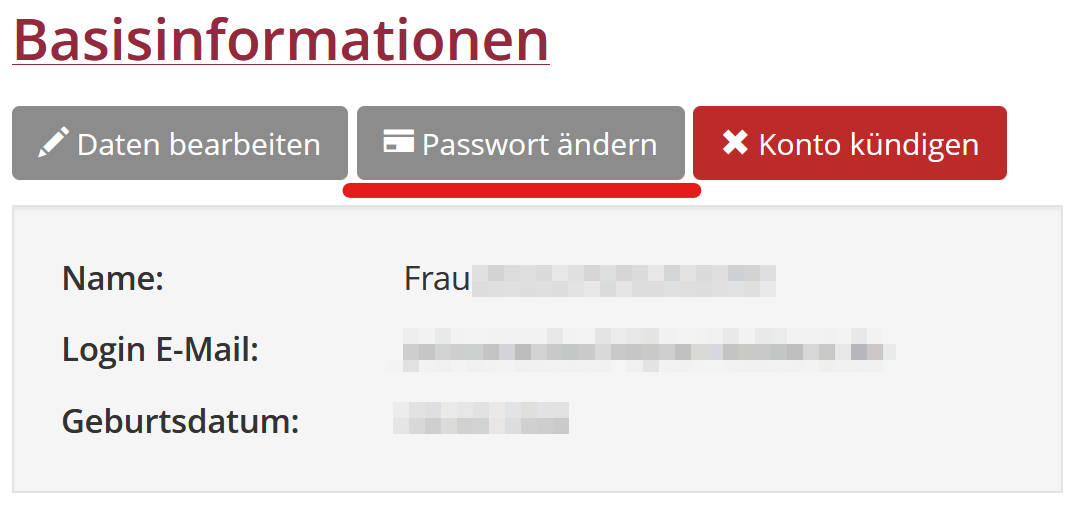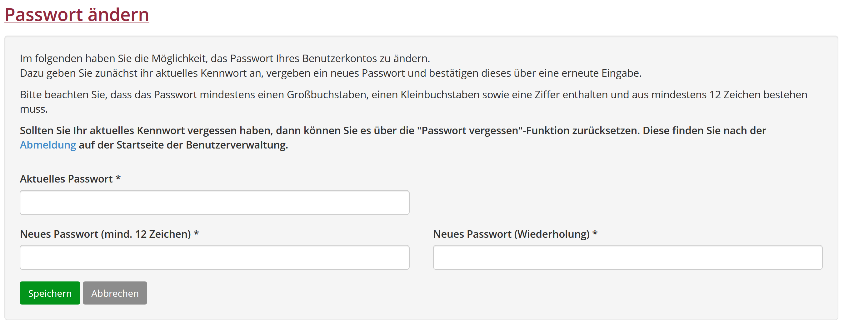 Der Benutzer kann jederzeit sein Passwort ändern. Dies geschieht, indem der Benutzer auf der Anmeldeseite den Link Passwort vergessen anklickt, auf der nächsten Seite seine E-Mail-Adresse eingibt und mit Passwort zurücksetzen bestätigt.