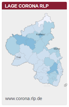 Zur Bevölkerungsinformation der aktuellen Covid-19 Lage ist nun auf der BKS-Portal.rlp-Startseite ein mit dem RKI-Lageinterface in den rechten Startseitenleistenblock eingestellt. Durch Anklicken auf die Karte oder den darunterstehenden Link gelangen Sie auf das offizielle Covid-19 Informationsdashboard. Hier werden die aktuellen bundesweiten Infektionsstatistiken vom Robert-Koch-Institut eingeblendet.