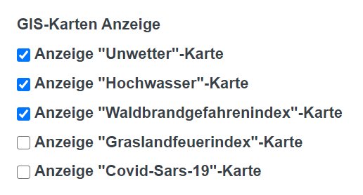 Wie man sieht, kann man die "Unwetter"-, "Waldbrandgefahrenindex"-, "Graslandfeuerindex"-Karte vom Deutscher Wetterdienst, die "Hochwassermeldungen für den Mittelrhein"-Karte vom Landesamt für Umwelt und die "Corona Warn- und Aktionsplan RLP"-Karte der Staatskanzlei Rheinland-Pfalz anzeigen lassen.
