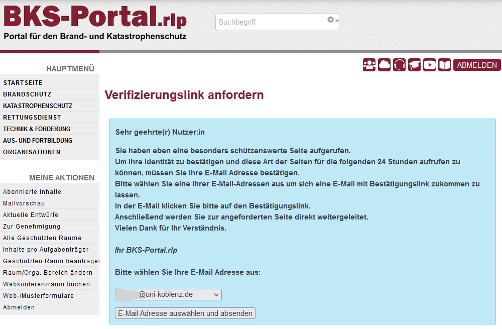 Nach Auswahl der gewünschten E-Mail-Adresse zur Verfizierung und dem Absenden des Formulars "Verifizierungslink anfordern", wird eine E-Mail an das ausgewählte Postfach versendet. In der E-Mail zur Verfizierung ist ein Link erhalten, der aufgerufen werden muss, um den Zugriff auf das eigene Postfach zu bestätigen. Nachfolgend wird man auf die Seite des jeweiligen Moduls im BKS-Portal.rlp zurückgeleitet und kann fortfahren.