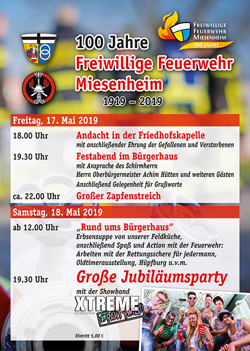 Die Feuerwehr Miesenheim wird in 2019 100 Jahre alt. Daher möchten wir dieses Ereignis am Wochenende mit Euch feiern: