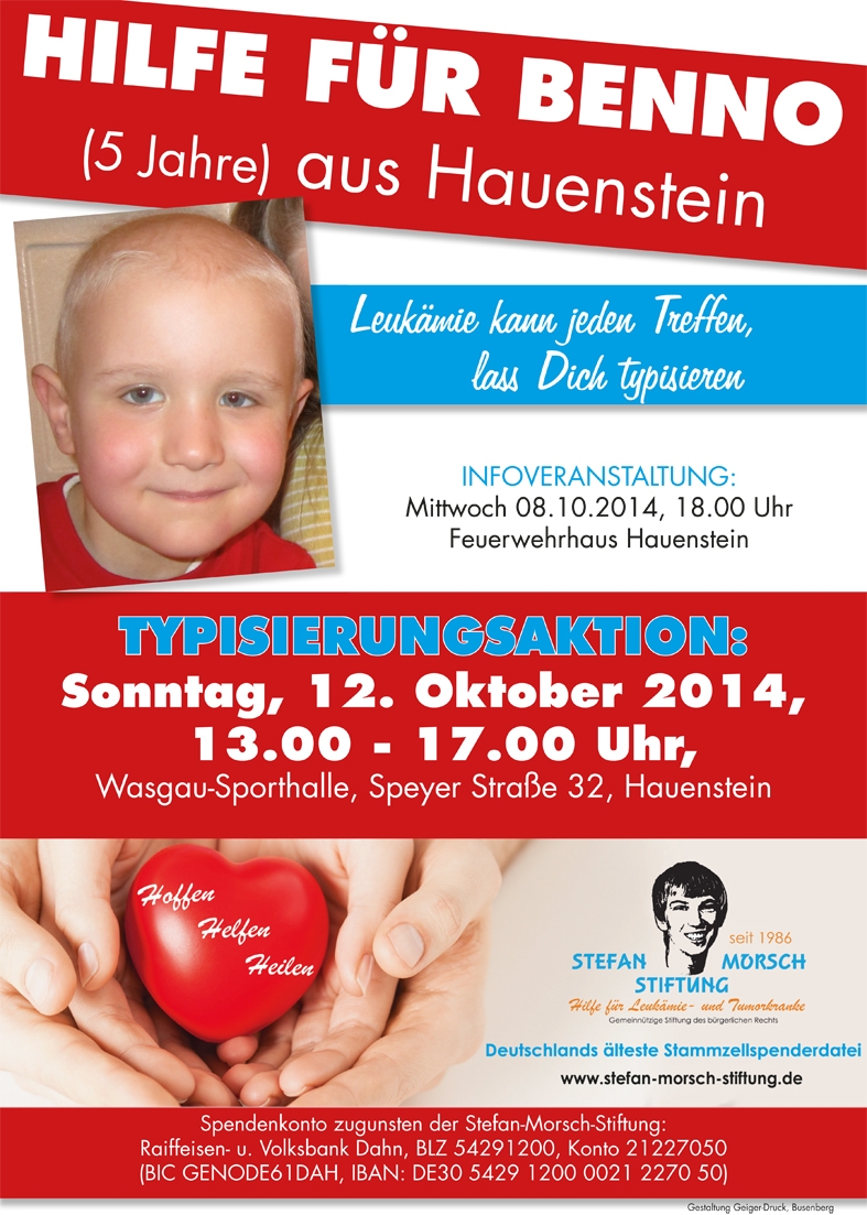 Benno ist fünf Jahre alt. Eigentlich sollte er in den Kindergarten in Hauenstein (Kreis Südwestpfalz) gehen und mit den anderen Jungs Feuerwehrmann spielen. Das ist nämlich seine Leidenschaft. Aber er kann und darf nicht. Denn Benno hat Leukämie und bekommt Chemotherapie. Jetzt starten seine großen Freunde von der Freiwilligen Feuerwehr Hauenstein zusammen mit dem THW und dem DRK Ortsverband eine Hilfsaktion, denn Benno braucht einen Lebensretter. Deshalb wird nun zusammen mit der Stefan-Morsch-Stiftung, Deutschlands ältester Stammzellspenderdatei, eine Typisierungsaktion organisiert: Am Sonntag, 12. Oktober, 13 bis 17 Uhr, kann sich jeder, der bereit ist, einem an Leukämie erkrankten Menschen wie Benno zu helfen, als Stammzellspender registrieren lassen – ein Fingerhut voll Blut genügt.