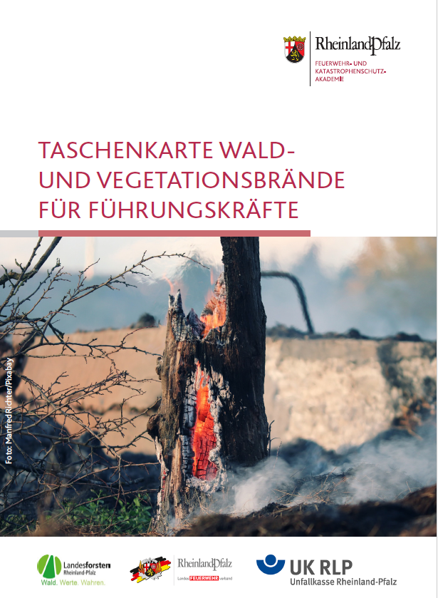 Zur schnellen Übersicht mit Blick auf Taktik und Sicherheit bei solchen Einsatzlagen hat die Feuerwehr- und Katastrophenschutzakademie Rheinland-Pfalz in Kooperation mit Landesforsten Rheinland-Pfalz, Unfallkasse Rheinland-Pfalz und dem Landesfeuerwehrverband Rheinland-Pfalz die Taschenkarte Wald- und Vegetationsbrandbekämpfung für Führungskräfte entwickelt.