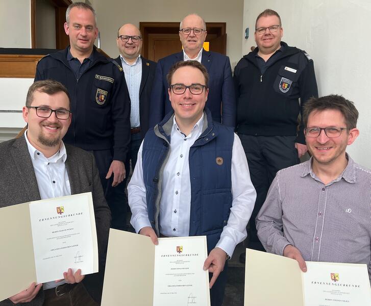 Kreis Altenkirchen. Lag der öffentliche Fokus beim Katastrophenschutz im Kreis Altenkirchen zuletzt durch die Anschaffung neuer Sirenen eher auf dem Material, so bedeutet dies nicht, dass der „Faktor Mensch“ als zweite wichtige Säule vernachlässigt wird. Vor diesem Hintergrund hat Landrat Dr. Peter Enders dieser Tage drei neue Organisatorische Leiter vereidigt: Marvin Würtz (Birken-Honigsessen), Steffen Nilius (Dauersberg) und Jonas Becker (Birnbach) sind nun offiziell Ehrenbeamte des Landkreises.