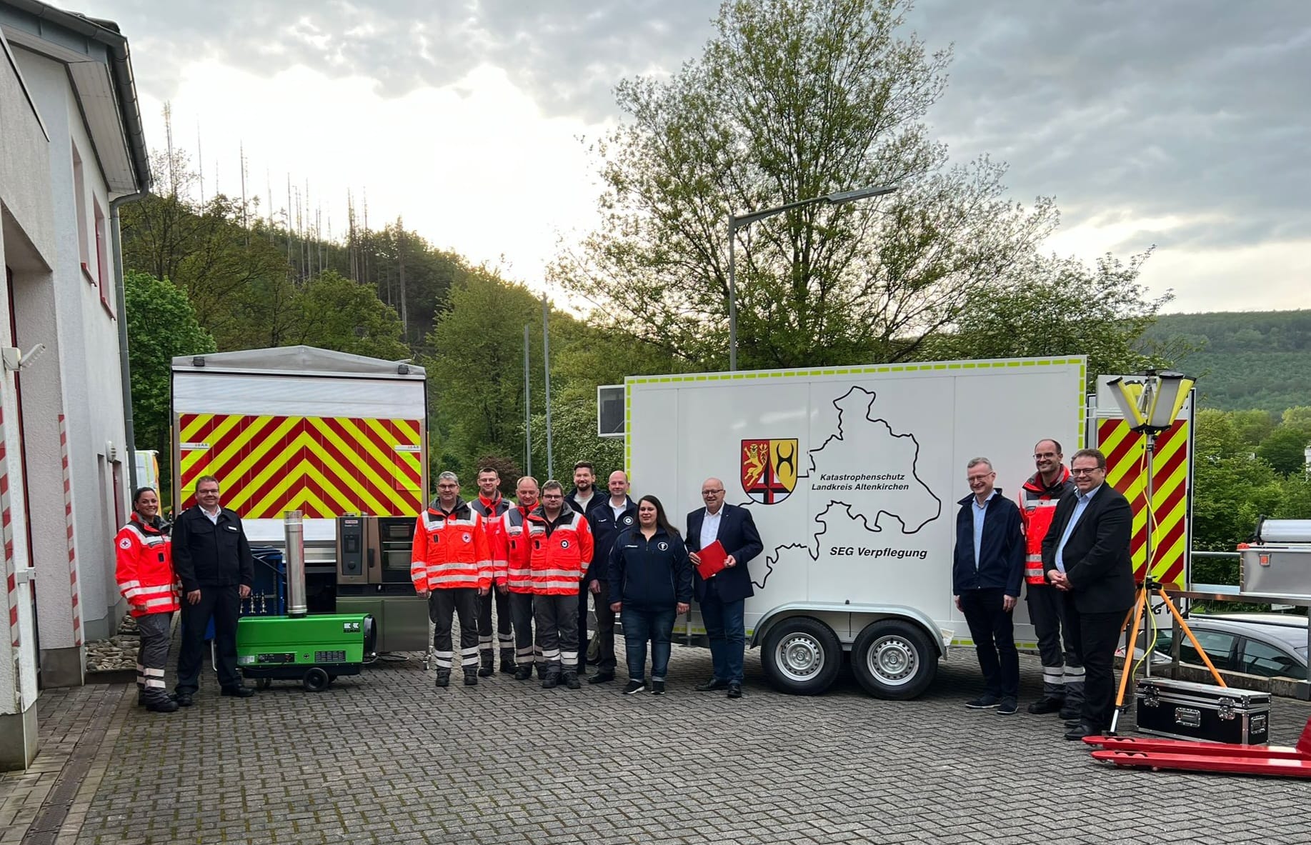 Diese Gruppe verfügt seit Kurzem über eine ganze Reihe von neuen Ausstattungselementen. Zur offiziellen Übergabe durch den Landkreis war Landrat Dr. Peter Enders jetzt nach Herdorf gekommen, denn: Die SEG „Verpflegung“ rekrutiert sich aus Aktiven des örtlichen DRK-Ortsvereins, die allesamt die entsprechenden Fachdienstausbildungen absolviert haben. Im Einzelnen wurden beschafft: Ladebordwand für den Gerätewagen, Trinkwasserverteilung inklusive neuer Schläuche, Zeltheizung, Kombidämpfer, Kühlanhänger, Zelt- und Einsatzstellenbeleuchtung, Edelstahlklapptische und Hubwagen.