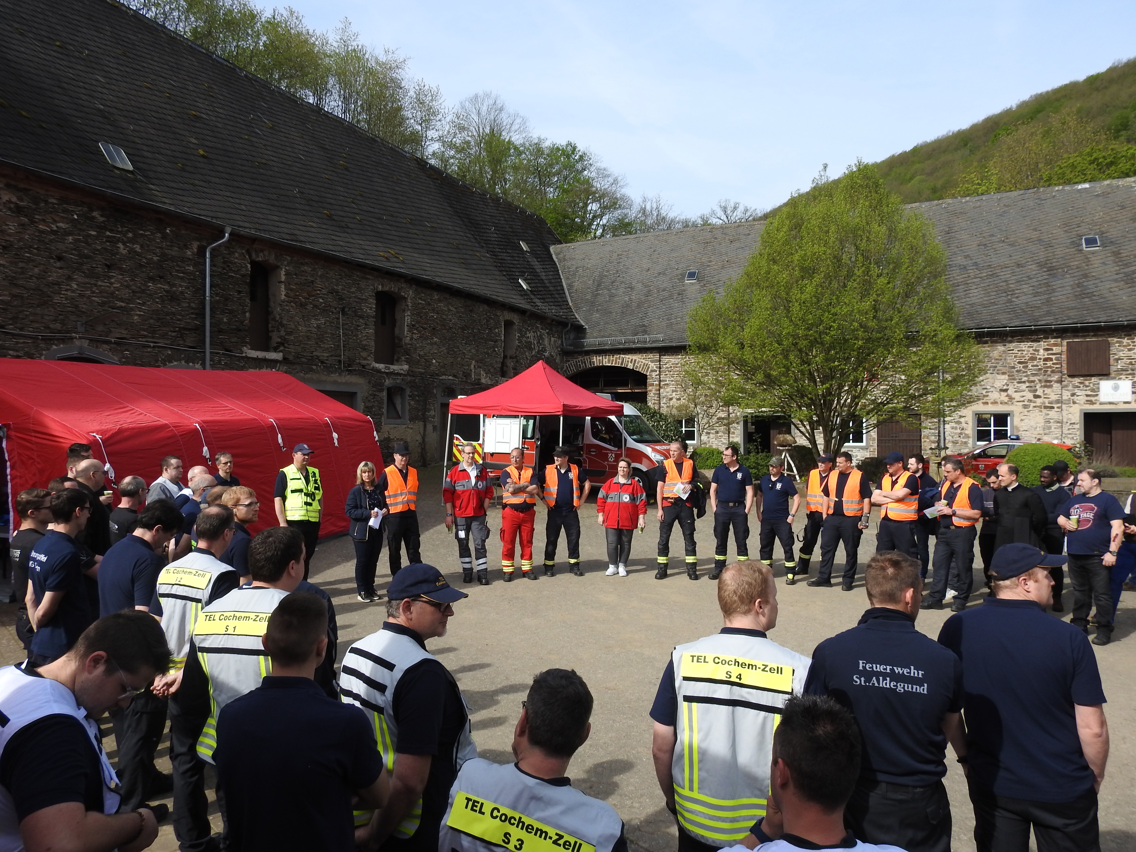 Am 13.04.2023 ab 12:00 Uhr übten insgesamt 152 Rettungskräfte aus den Landkreisen Cochem-Zell und Mayen-Koblenz am Kloster Engelport in Treis Karden den Ernstfall. An der Übung waren diverse Feuerwehren, das DRK, die Abschnittsleitung Gesundheit sowie die Technische Einsatzleitung des Landkreises Cochem-Zell beteiligt. Von der Leistungsfähigkeit der Einsatzkräfte sowie den einzelnen Organisationen konnten sich neben der Klosterleitung auch Landrätin Anke Beilstein, VG-Bürgermeister Wolfgang Lambertz sowie Ortsbürgermeister Hans Josef Bleser vor Ort überzeugen.