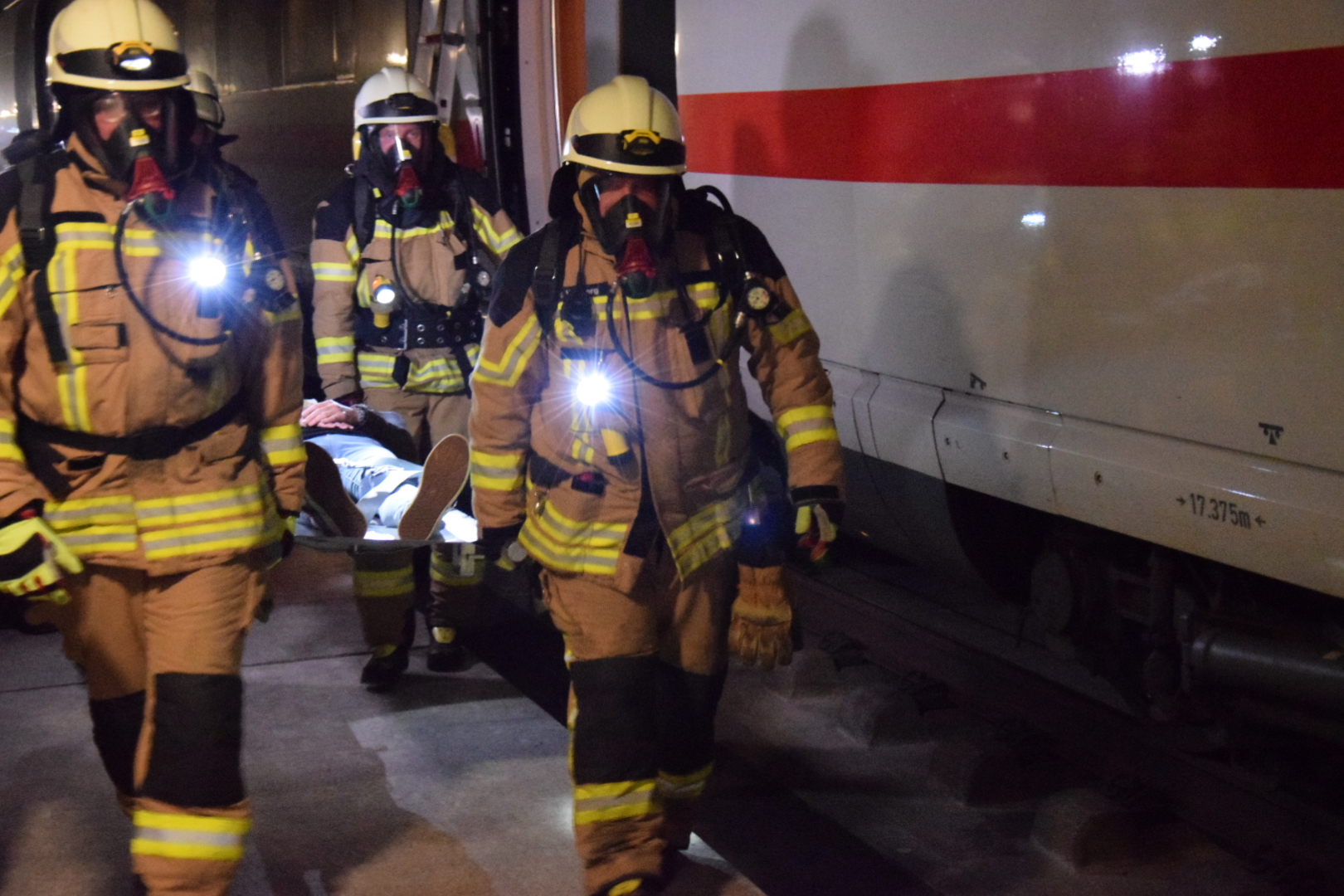 Gegen 23 Uhr sind die Einheiten bereits an den zugewiesenen Rettungsplätzen und können die Abläufe in Ruhe durchsprechen und nochmals abstimmen. Denn für viele jüngere Feuerwehrleute ist solch eine Großübung erstmalig. Aufgrund des engen Zeitfensters für die Übung werden alle Gerätschaften bereitgelegt und vorbereitet, damit es nach der Freigabe der Strecke direkt losgehen kann.