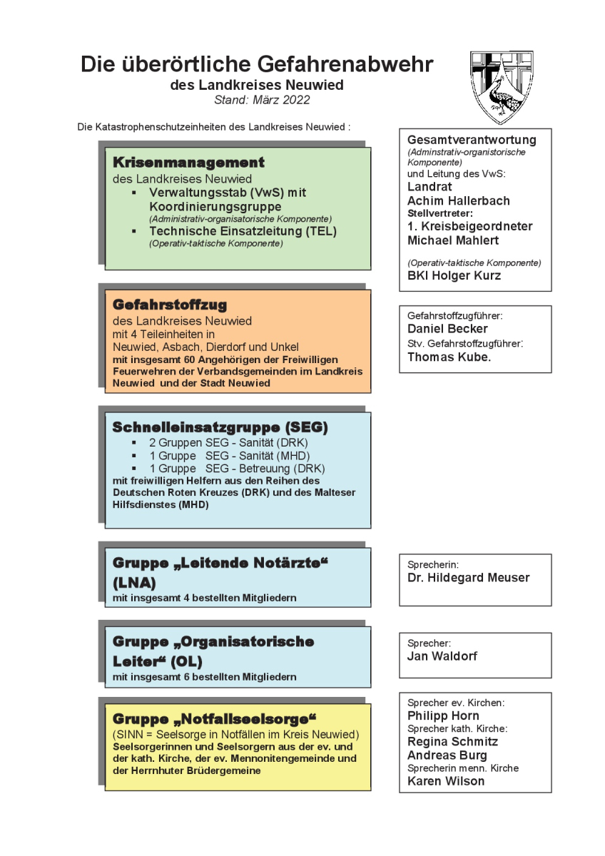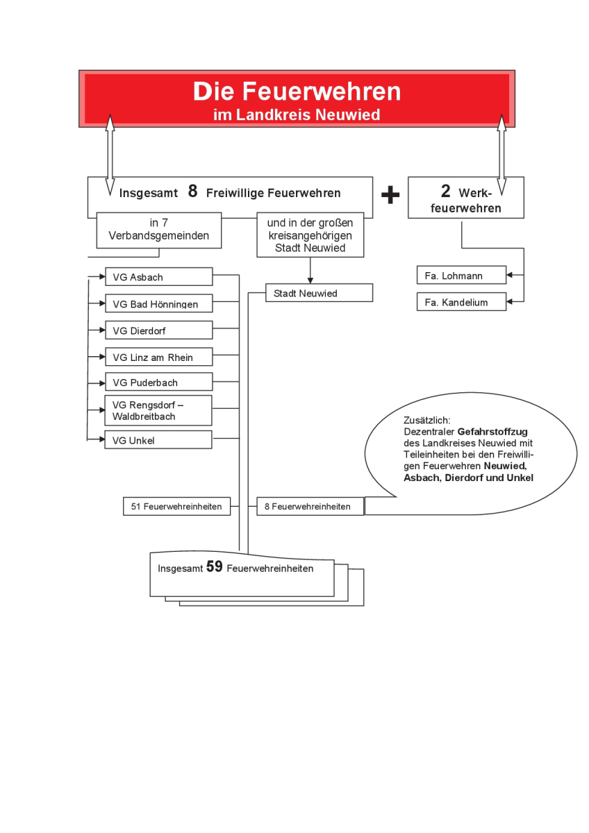 Im Landkreis Neuwied bestehen in den Feuerwehren der sieben Verbandsgemeinden und der Stadt insgesamt 59 örtliche Freiwillige Feuerwehreinheiten und 2 Werkfeuerwehren.