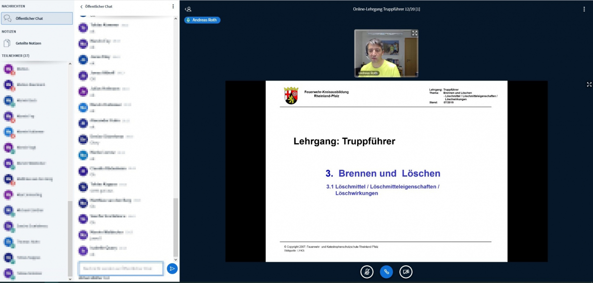 "Unter Berücksichtigung der zu diesem Zeitpunkt weiterhin geltenden Maßnahmen zur Bekämpfung der Corona-Pandemie, sowie der offensichtlichen Kosten- und Zeitvorteile für alle Beteiligten, haben wir uns dazu entschieden Teile des Lehrgangs virtuell stattfinden zu lassen.", begründete Andreas Hoffmann die Entscheidung und ergänzte sogleich, dass man die sinnvolle Einbindung digitaler Möglichkeiten nicht nur für diesen Lehrgang, sondern auch in Zukunft weiterverfolgen wird. Das Angebot des Landes, die auf der Software BigBlueButton basierende Online-Seminar Plattform "BKS-WebConf.rlp" nutzen zu können, kam dabei gerade zur rechten Zeit. Nach kurzem Test und Anmeldung der Veranstaltung konnte es losgehen.