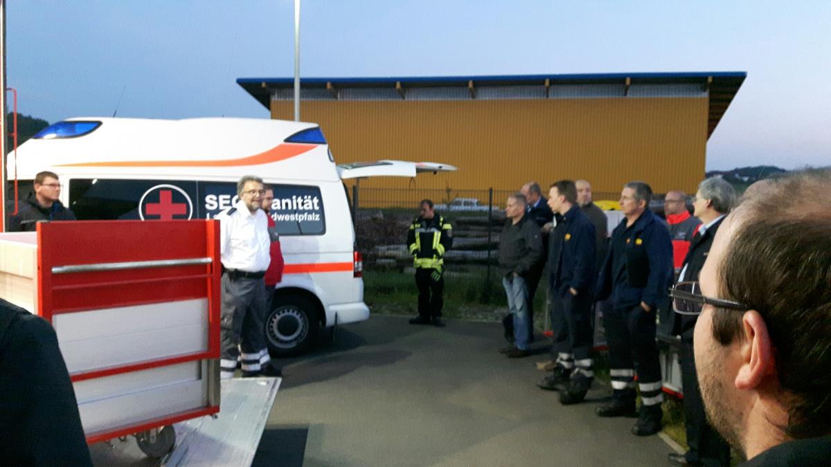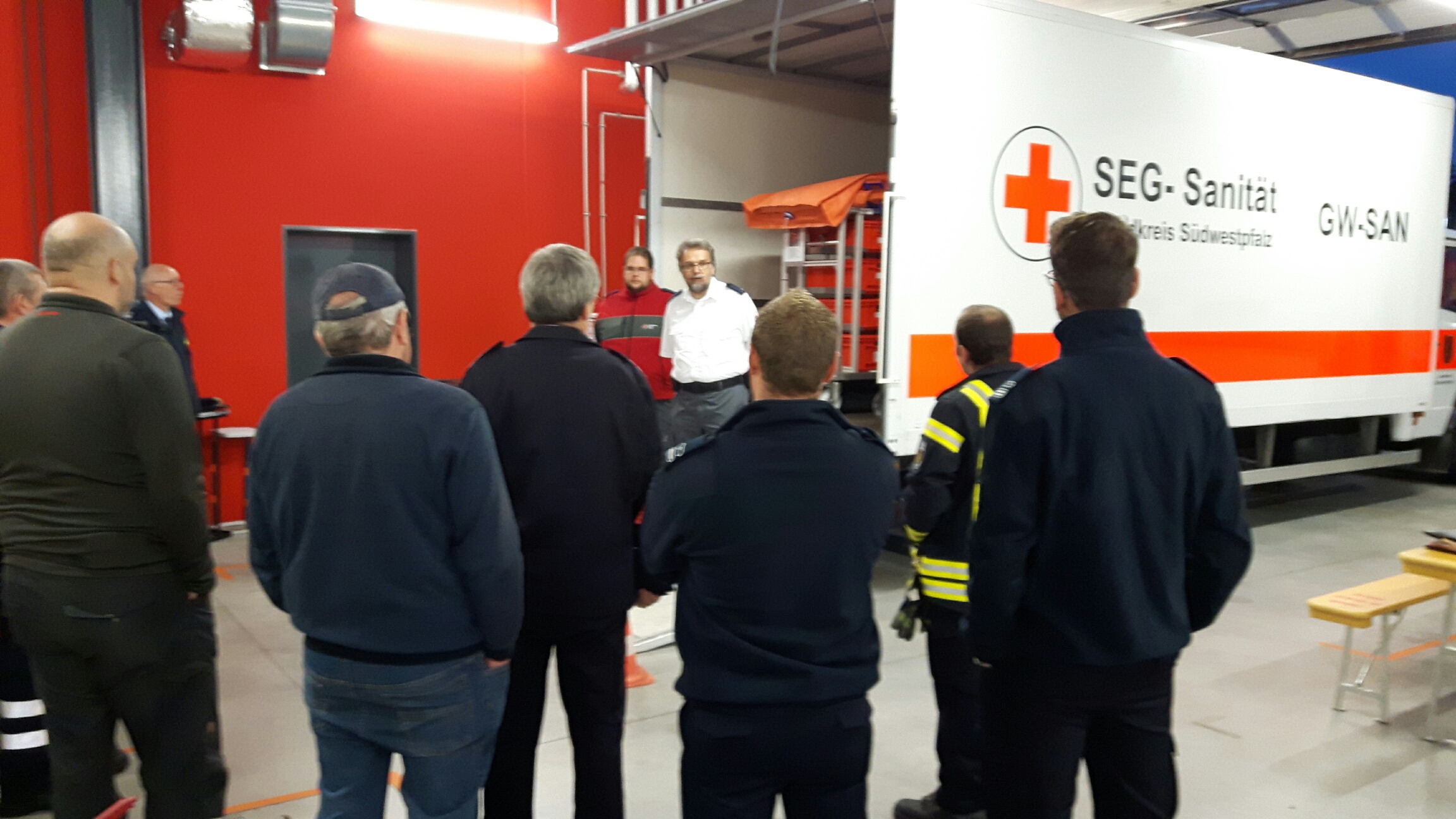 Danach führte der Leiter der SEG-Sanität Martin Schmidtke durch die Unterkunft der Einheit und erläuterte näher die Ausrüstung und den Fahrzeugbestand. Zuletzt stellte die Führung der SEG Betreuung und Verpflegung (Joachim Schneider und Philip Rieder), welche gemeinsam mit der Stadt Pirmasens betrieben wird, ihre Einheiten vor.
