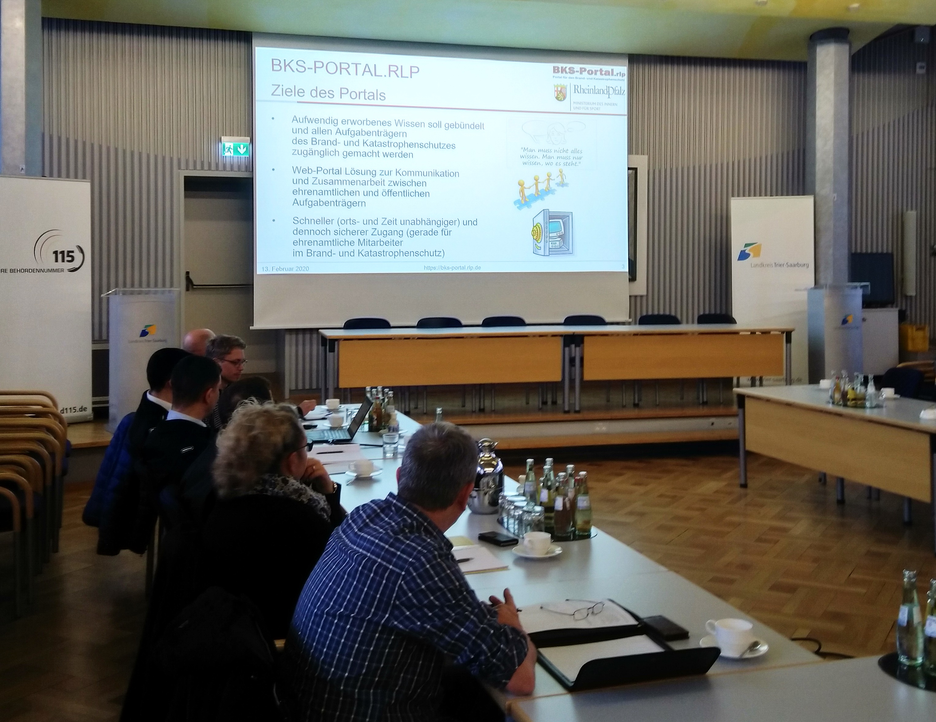 Trier. Am Donnerstag, dem 13. Februar trafen sich, nach Einladung durch die Leitung Kreisausbildung des LK Trier-Saarburg, die Sachbearbeiter vom Kreis und den Verbandsgemeinden sowie Kreisausbildungsverantwortliche im großen Sitzungssaal der Kreisverwaltung Trier-Saarburg. Der Leiter der Kreisausbildung Christoph Düpont und seine Stellvertreterin Christine Scherf hatten das Treffen mit dem Fokusthema „Organisation der Kreisausbildung mit dem BKS-Portal.rlp“ organisiert, um gemeinsam Chancen und Herausforderung in der digitalen Zusammenarbeit zu diskutieren. Mit dabei waren auch zwei Vertreter der Feuerwehr der kreisfreien Stadt Trier, die sich für die Neuerungen der digitalen Unterstützung mit der vom Land bereitgestellten Online-Plattform interessiert zeigten. Darüber hinaus waren Bernd Dochow (ADD) und Heiko Schweig (ADD) als offizielle Vertreter der Landesbehörden vor Ort, sowie Flemming Götz als Vertreter des Portal-Entwicklerteams der Forschungsgruppe Verwaltungsinformatik (Universität Koblenz-Landau).