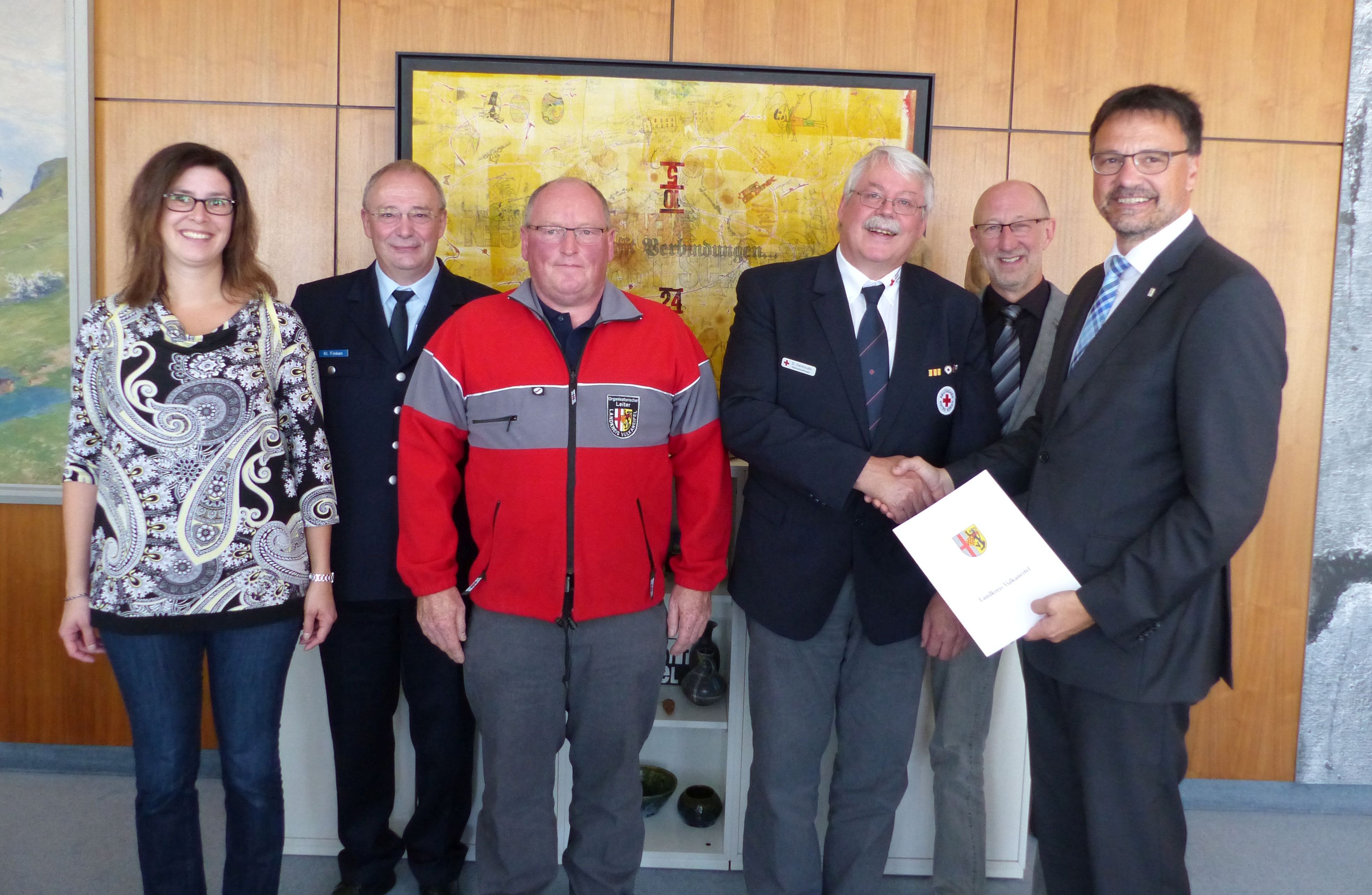 Landrat Thiel hat im Rahmen einer kleinen Feierstunde den Organisatorischen Leiter Dieter Demoulin von seinen Pflichten entbunden. Bereits im Jahr 2004 hatte Herr Demoulin die entsprechende Ausbildung an der Lehranstalt des DRK Landesverbandes in Mainz absolviert. Auf Vorschlag des DRK Kreisverbands Vulkaneifel, wurde er schließlich am 27.05.2008 zum Organisatorischen Leiter für den Landkreis Vulkaneifel ernannt. In seiner Funktion war er bei Schadensereignissen mit einer größeren Anzahl von Verletzten oder Erkrankten für die Ablauforganisation verantwortlich. Hierzu zählen z.B: das Beurteilen der Schadenslage, und das Erteilen von Einsatzaufträgen an die Rettungseinheiten, Registrierung von Erkrankten und Verletzten, die Festlegung von Behandlungsplätzen oder die Organisation des Patientenabtransports. In den vergangenen sieben Jahren hat Herr Demoulin einige solcher Einsätze erfolgreich gemeistert. Hier kam ihm auch seine Erfahrung als ausgebildeter Rettungsassistent zu Gute.