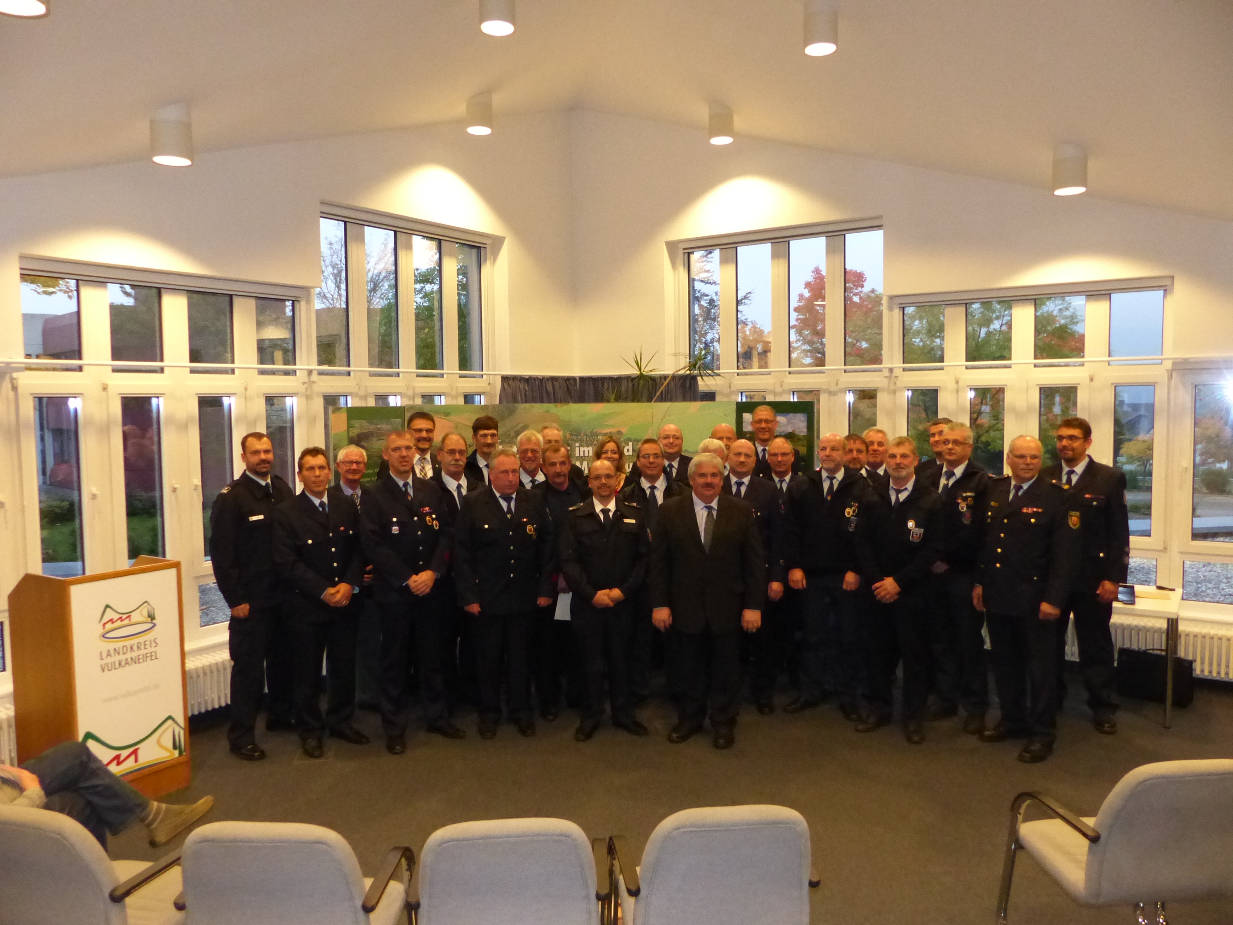 Die geehrten Feuerwehr-Kameraden mit Landrat Heinz-Peter Thiel, Kreisfeuerwehrinspekteur Christoph Bach, stv. Kreisfeuerwehrinspekteur Thomas Risch, 1. Beigeordneten Hartwig Noth und stv. Wehrleiter Martin Zinic, (VG Daun), Bürgermeisterin Heike Bohn und Wehrleiter Wolfgang Rechs (VG Hillesheim), Bürgermeister Karl Häfner und Wehrleiter Arno Radermacher (VG Kelberg) sowie Beigeordneter Wilhelm Heinzius und Wehrleiter Dominik Schüler (VG Obere Kyll))