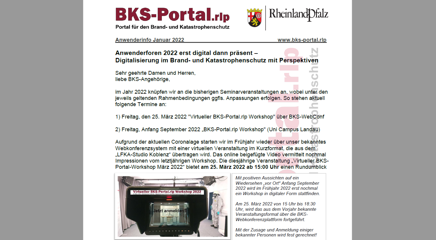 © BKS-Portal.rlpAnwenderinfo Januar 2022 - Neue Termine und Anmeldung für den virtuellen Workshop freigeschaltet Datum der Meldung: 21.01.2022Anhänge zur Meldung: 22 0219-BKS-Portal Info Jan.pdf