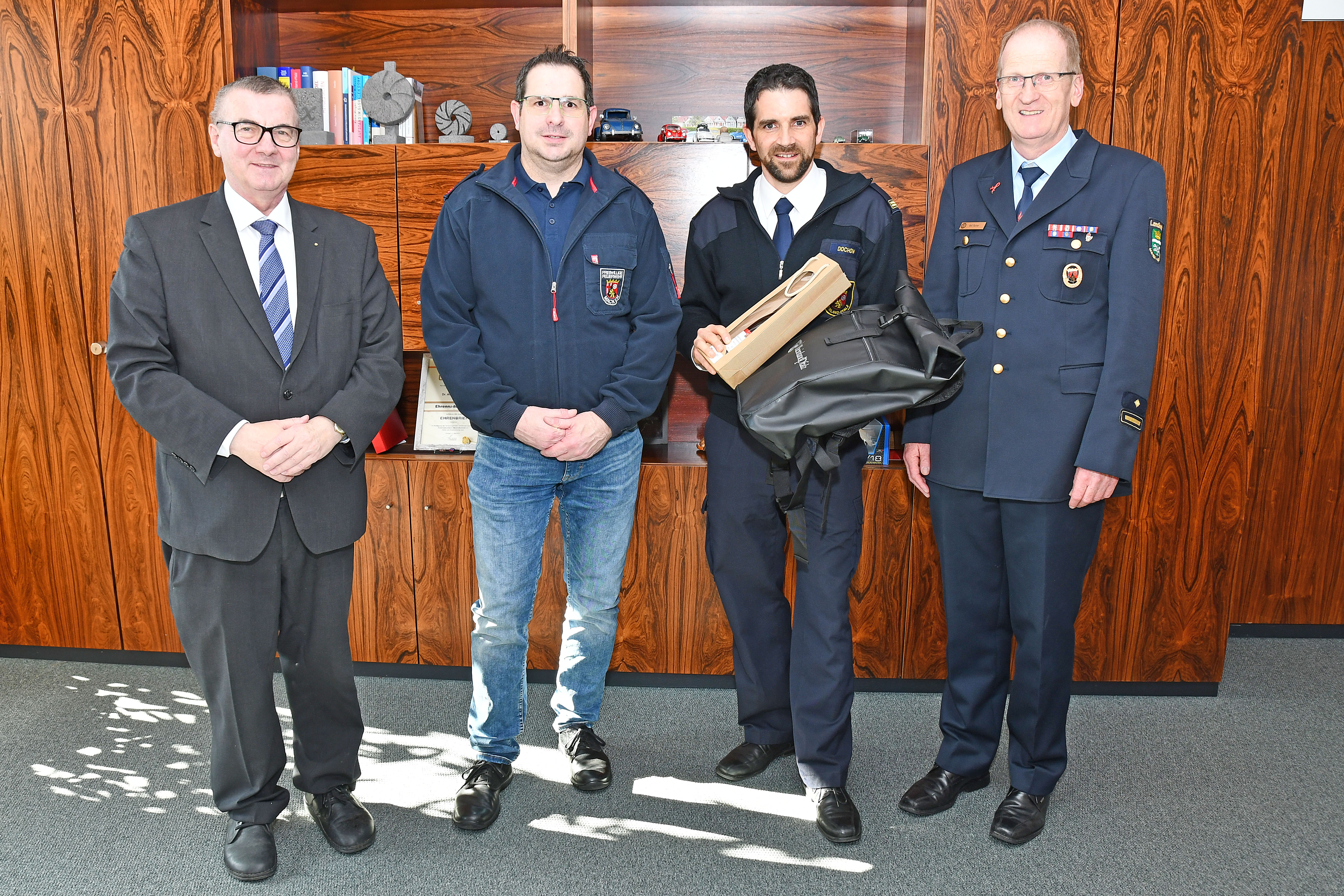 Im Bild v. l. n. r.: Landrat Dr. Alexander Saftig, Thorsten Hirt (Feuerwehr Macken, 25000 Nutzer), Bernd Dochow (ADD), Rainer Nell (BKI LK Mayen-Koblenz)