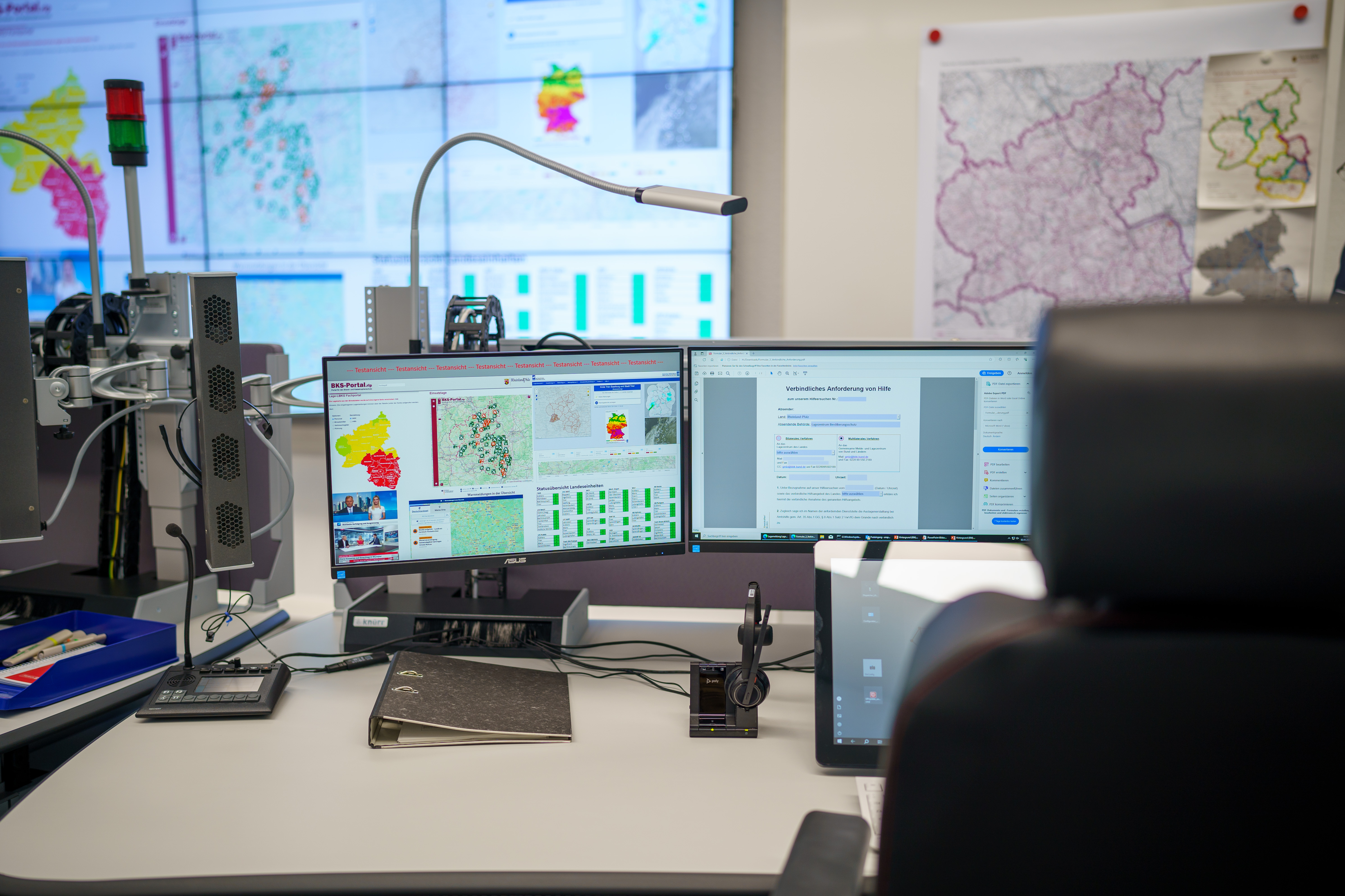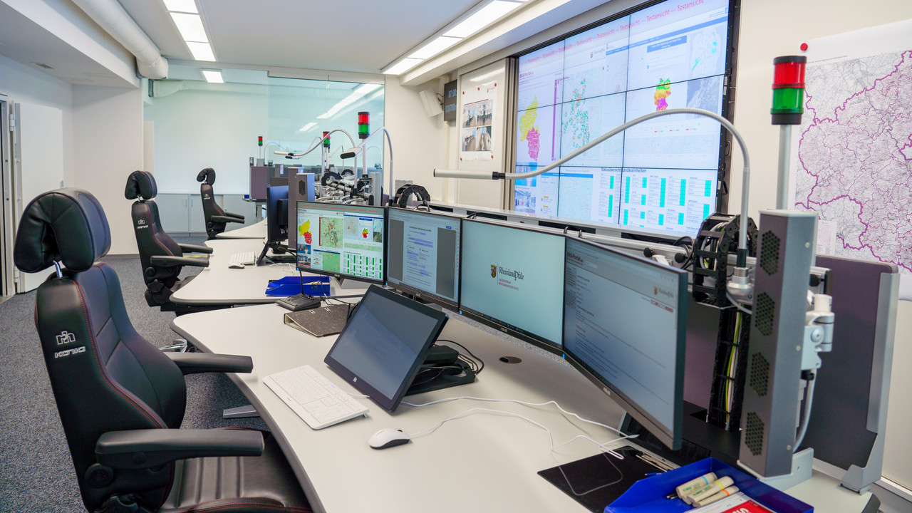 Im Rahmen des Unterzeichnungstermins machten sich Ebling und Tiesler auch ein Bild von den als Stabräumen bei Großschadenslagen nutzbaren Räumlichkeiten sowie von der Baustelle des Lagezentrums. Dabei informierten sie sich über die beispielhaften Abläufe anhand des Beispielszenarios einer sehr großen Waldbrandlage.