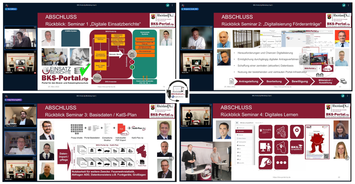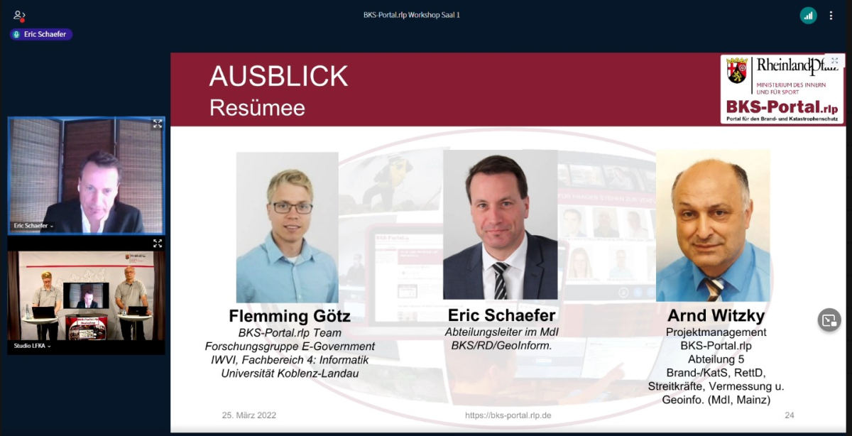 Eric Schaefer, der für Brandschutzfragen zuständige Abteilungsleiter im MdI hatte die Berichte online mitverfolgt und dankte nochmal allen Mitwirkenden. „Der heutige Workshop belegt, dass wir mit der Portalidee auf allen Ebenen im BKS angekommen sind. Von Praktikern für Praktiker und die Einbindung von Forschung und Lehre sind Alleinstellungsmerkmale, die dem Portalprojekt zum Erfolg verholfen haben.“