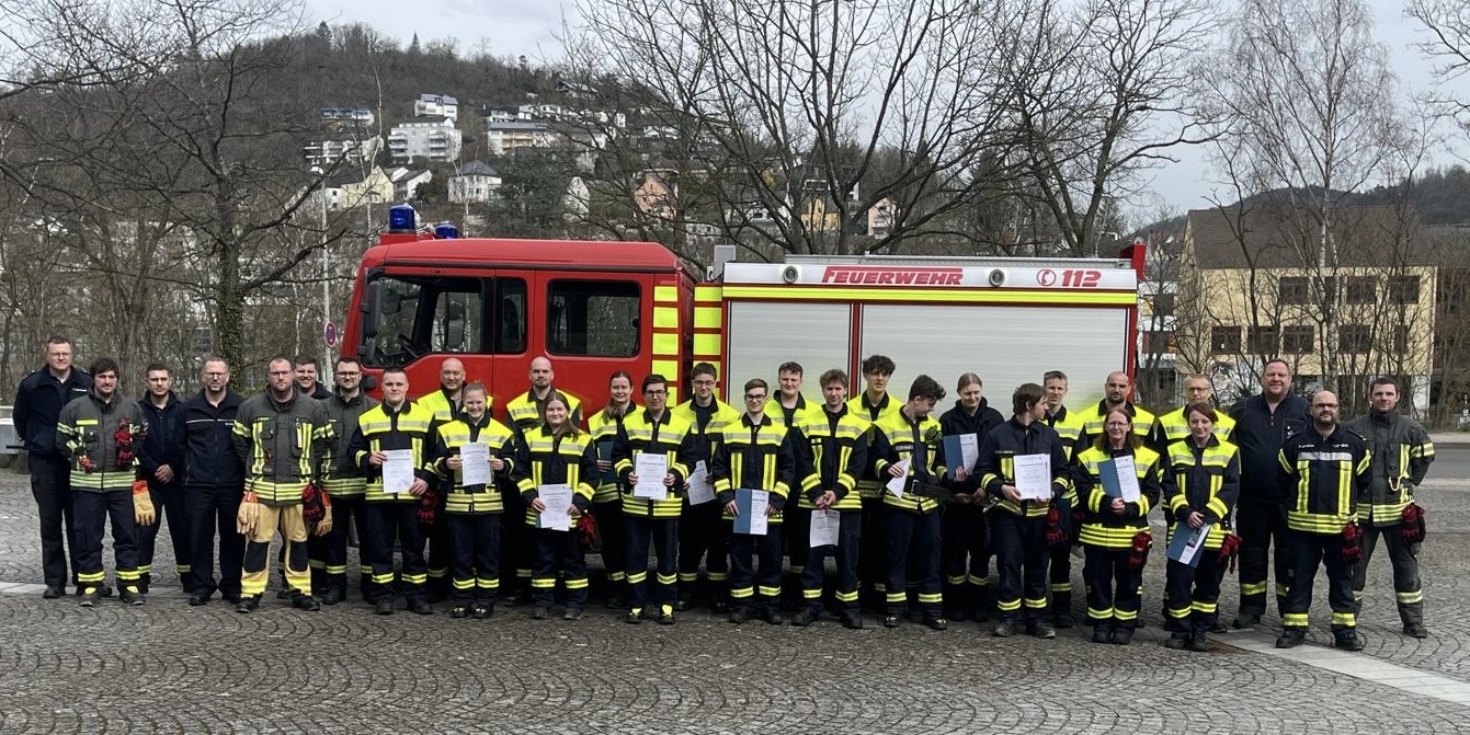 Im ersten Halbjahr 2025 wurden 20 neue Feuerwehrangehörige für die Aufgaben in der Feuerwehr erfolgreich mittels der neu eingeführten hybriden Ausbildung ausgebildet. Diese neue Form der Ausbildung ermöglicht es den Teilnehmerinnen und Teilnehmern die theoretischen Kenntnisse über eine interaktive Lernplattform, die vom Land Rheinland-Pfalz zur Verfügung gestellt wird, in Eigenregie in einem festgelegten Zeitraum zu erlernen. Damit möchte die Ausbildungsleitung der Feuerwehren in der Verbandsgemeinde Bad Ems-Nassau den neuen Anforderungen im Hinblick auf die Vereinbarkeit zwischen Ehrenamt und privaten bzw. beruflichen Interessen gerecht werden. So verkürzte sich durch den Online Unterricht die Präsenzpflicht von acht Tagen auf drei Samstage und zwei Abendveranstaltungen, was sehr positiv von den Lehrgangsteilnehmern aufgenommen wurde. Die freie Zeiteinteilung sowie das zeitliche Pensum des Lernens, waren die überwiegenden Vorteile, die die Teilnehmerinnen und Teilnehmer über den neu eingeschlagenen Weg der Feuerwehrausbildung nannten. Ob alle Teilnehmer das geforderte theoretische Wissen erlernten, wurde anhand von Kontrollfragen durch die Ausbilder während der Lernphase abgefragt, sowie die Teilnahme kontrolliert, außerdem bestand bei mehreren Webmeetings die Möglichkeit für die Teilnehmer, Fragen an die Ausbilder zu stellen. Im Anschluss an das Selbststudium ging es dann mit den praktischen Lerneinheiten am Standort Nassau für drei Samstage weiter. Dort vermittelte über diesen Zeitraum ein erfahrenes Ausbilderteam die erforderlichen Grundkenntnisse im Bereich Brandbekämpfung, Menschenrettung sowie in der technischen Hilfe. Als Abschluss galt es dann für die Teilnehmerinnen und Teilnehmer des Lehrganges das Erlernte in einer theoretischen sowie praktischen Prüfung unter Beweis zu stellen. Das bei der Prüfung anwesende Wehrleiterteam unter Wehrleiter Mark Horbach und seinem Stellvertreter Karl Peter Salzmann zeigten sich über die Ergebnisse zufrieden und danken allen neuen Feuerwehrkameradinnen und Kameraden für ihr Engagement in diesem wichtigen Ehrenamt, bevor alle aus den Händen des Ausbildungsleiters Thorsten Massenkeil die Lehrgangsurkunden ausgehändigt bekamen. Auch galt der Dank der Wehrleitung dem dreizehnköpfigen Ausbilderteam, ohne die es nicht möglich wäre neue Kräfte für die Feuerwehren auszubilden.