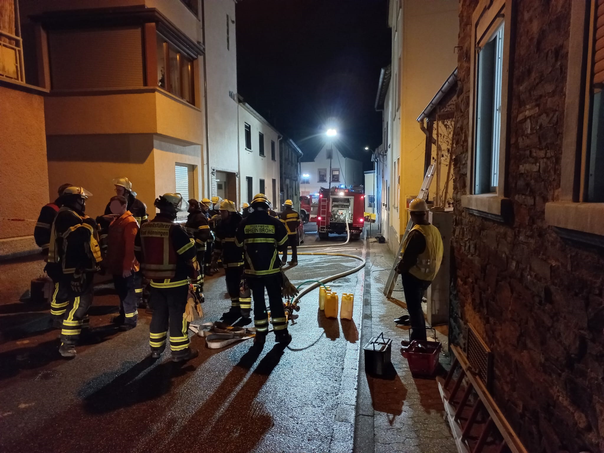 Als die ersten Kräfte an der Einsatzstelle in der eng bebauten Ortsmitte von Rheinbrohl eintrafen hatte sich das Feuer bereits im Gebäude ausgebreitet. Dichter Rauch drang aus dem Wohnhaus, in dem glücklicherweise keine Personen mehr waren.