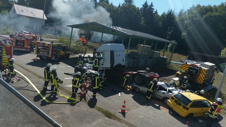 Die Aufgaben der Feuerwehr werden immer vielfältiger. Die Feuerwehren der Verbandsgemeinde Emmelshausen decken den größten Abschnitt auf der BAB 61 des Rhein-Hunsrück-Kreises ab. Hier bewähren sich die gute Ausrüstung sowie eine fundierte Ausbildung bei der Bewältigung des sehr breit gefächerten Einsatzspektrums. Am Samstag, den 08.09.18 um 14:00 Uhr schrillten die Funkmeldeempfänger der Feuerwehrangehörigen. Die Feuerwehreinsatzzentrale in Emmelshausen alarmierte die Einheiten aus Pfalzfeld, Emmelshausen, Gondershausen, Beulich, Dörth und Lingerhahn. Grund war eine simulierte Massenkarambolage / Verkehrsunfall mit einem LKW und sechs PKW, sowie mehrere darin eingeschlossene, verletzte Personen. Dieses Einsatzszenario stellte für die Einsatzkräfte eine besondere Herausforderung dar. Eine absolut gelungene Aktion, welche die wichtige und kompetente Arbeit der Feuerwehren in einen sichtbaren Fokus gerückt hat: an der Übung nahmen rund 60 Einsatzkräfte der Verbandsgemeinde sowie Helfer der Jugendfeuerwehr und Altersabteilung der Feuerwehr Pfalzfeld teil. Realitätsnah wurden Statisten geschminkt und ein PKW realitätsnah in Brand gesetzt. Die Führungsstaffel (Einsatzleitung der Verbandsgemeinde) bildete 3 Einsatzabschnitte, um die 13 eingeschlossenen Personen möglichst schnell und koordiniert aus ihrer Zwangslage befreien zu können. Nach knapp 1,5 Stunden konnte man die letzte Lagemeldung übermitteln: „ Alle Personen gerettet und Übung beendet!" Im Anschluss traf man sich im Gerätehaus Pfalzfeld zu einer Nachbesprechung und Fachgesprächen. Bürgermeister Peter Unkel, Ortsbürgermeister Peter Hammes, Kreisfeuerwehrinspekteur Stefan Bohnenberger, Mitglieder des Verbandsgemeinderats sowie zahlreiche Gäste und Zuschauer verfolgten das Geschehen mit großem Interesse. Bürgermeister Peter Unkel würdigte im Anschluss das große Engagement der Einsatzkräfte im Rahmen der Übung sowie bei den vielen Einsätzen und Veranstaltungen in der Region. Für die sehr erfolgreiche Planung und Durchführung der beeindruckenden Übung dankte er besonders der Führung der Feuerwehr Pfalzfeld und den Mitgliedern der Feuerwehr Lingerhahn. Außerdem nutzte der VG-Chef die Gelegenheit, um Daniel Korbion von der Feuerwehr Dörth zum Truppführer zu ernennen und zum Hauptfeuerwehrmann zu befördern. Ein weiterer Dank gilt der Firma Filox-Mothermik für die Bereitstellung ihres Firmengeländes, sowie den Unternehmen Schmitt aus Birkheim, Auto Menzel aus Pfalzfeld und Lenz Abschleppdienst aus Plaidt, welche beim Transport und der Entsorgung der Fahrzeuge unterstützt haben.