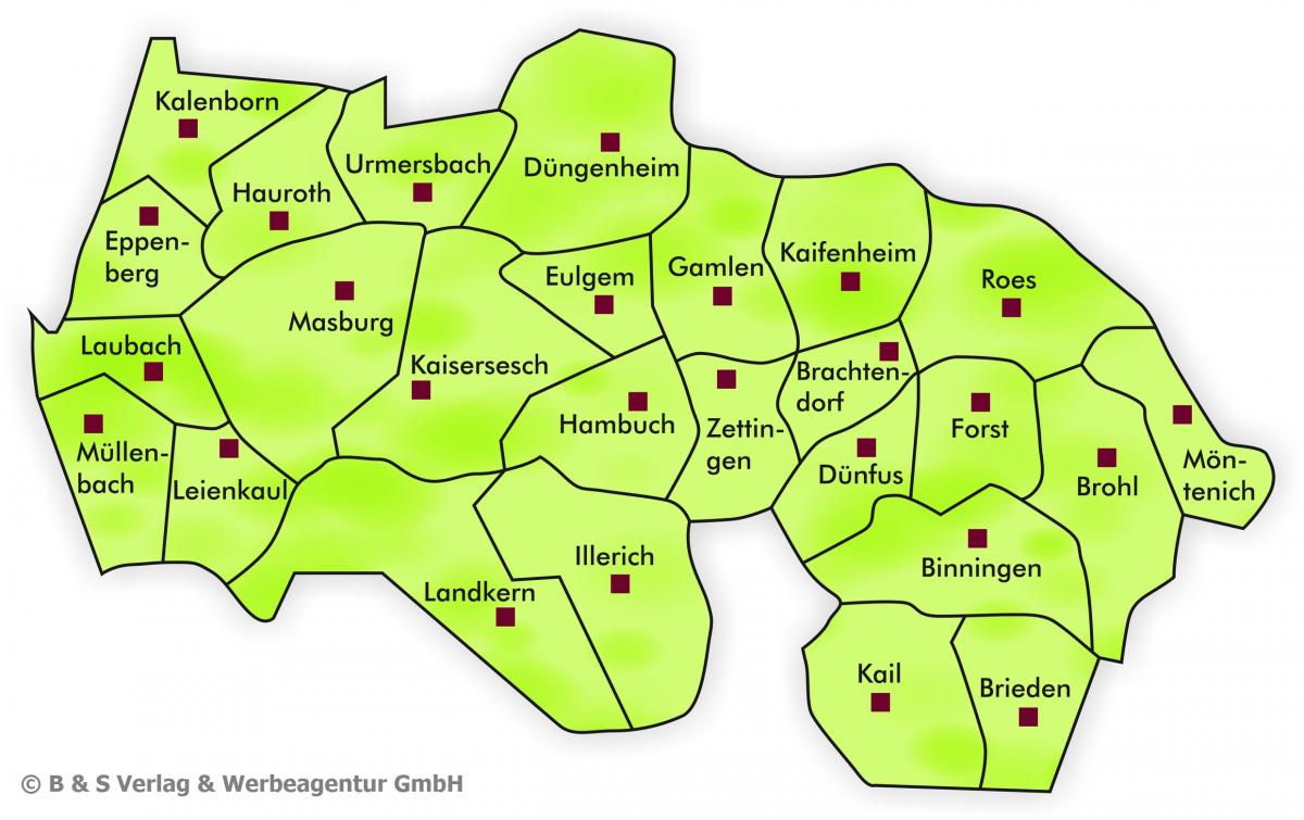 Die Verbandsgemeinde Kaisersesch verfügt mit ihren Ortsgemeinden Binningen, Brachtendorf, Brieden, Brohl, Dünfus, Düngenheim, Eppenberg, Eulgem, Forst,  Gamlen, Hambuch, Hauroth, Illerich, Kaifenheim, Kail, Kalenborn, Landkern, Laubach, Leienkaul, Masburg, Möntenich, Müllenbach, Roes, Urmersbach, Zettingen und der Stadt Kaisersesch über mehr als 16.000 Einwohner und einer Fläche von über 140 Km².
