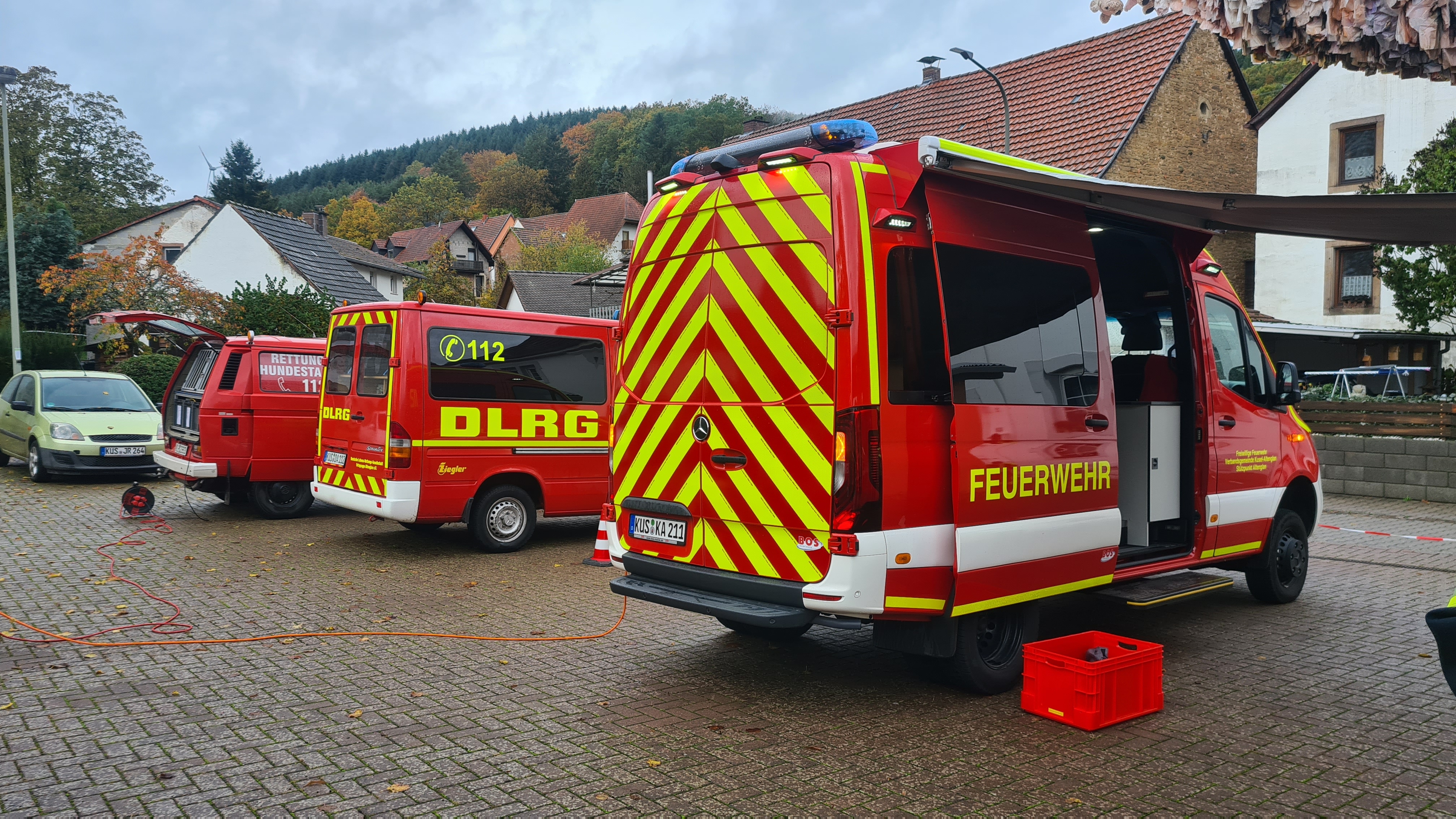 Das Szenario waren mehrere vermisste Personen, die zuletzt am Wohnmobilstellplatz in Patersbach gesehen wurden und zu Fuß den Heimweg von einer Party antreten wollten, zuhause aber teilweise nicht angekommen sind. Es konnten von 2 Personen Kleidungsstücke gesichert werden, welche als Geruchsstoff für die Mantrailer der Rettungshundestaffel der DLRG OG Altenglan dienten. Mit Auffinden der ersten vermissten Personen wurde bekannt dass sich noch weitere Personen fußläufig auf dem Heimweg durch angrenzende Wald- & Wiesengebiete gemacht haben. Hiermit wurde der Einsatz der Flächensuchhunde der Facheinheit für Rettungshunde des LK Kaiserslautern und der Drohneneinheit der VG Kusel-Altenglan notwendig, welche daraufhin alarmiert wurden. Aufgrund der Wetterlage konnte die Drohneneinheit ihre Drohne nicht in den Einsatz bringen.
