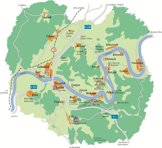 Folgt man von Trier aus dem Lauf der Mosel, so begegnet man ab Kenn und bis nach Trittenheim den 18 Gemeinden und der Stadt Schweich der "ROEMISCHEN WEINSTRASSE".