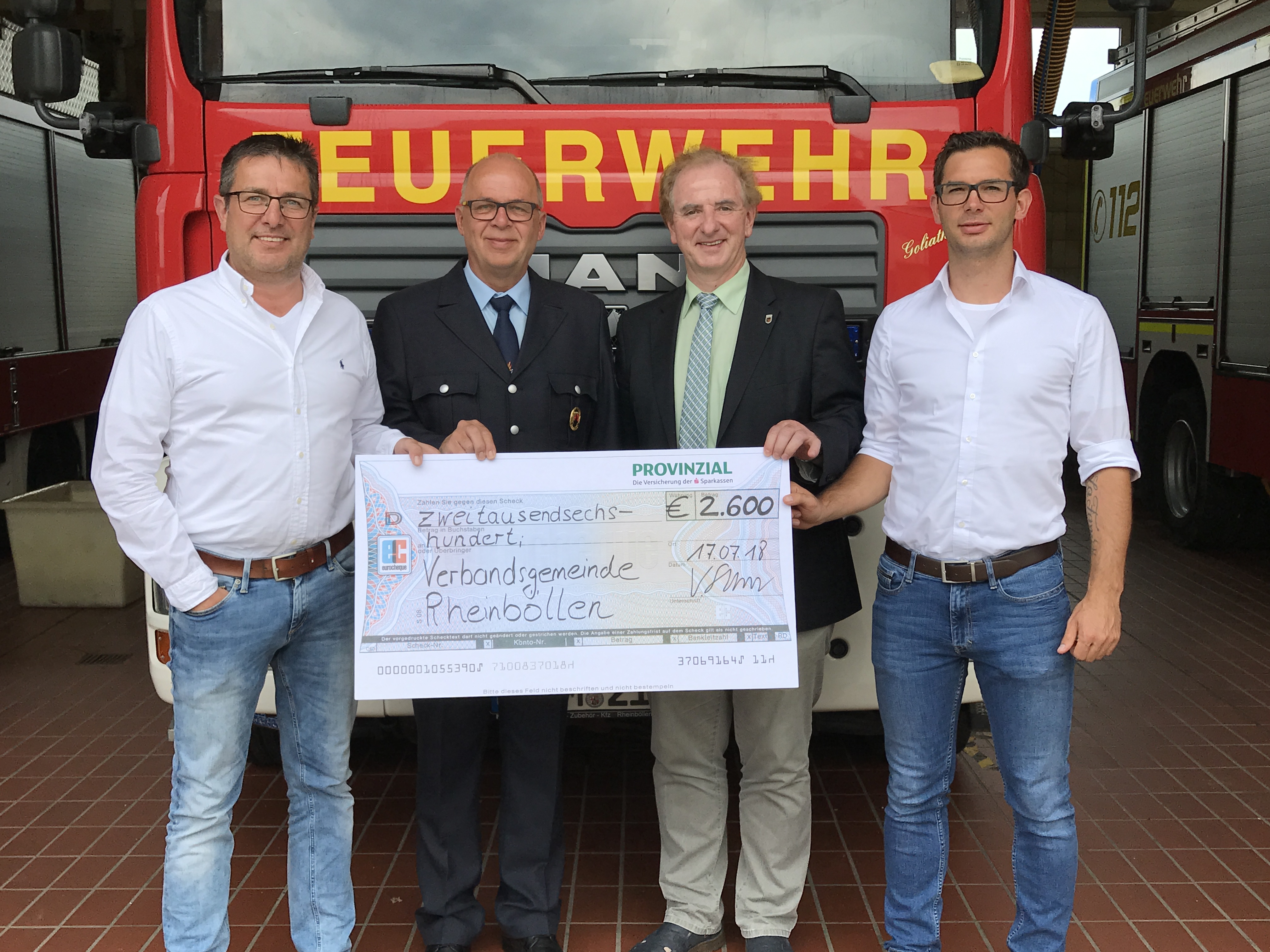Die Provinzial Rheinland fördert in ihrem Geschäftsgebiet Maßnahmen zur Verhütung und Bekämpfung von Gefahren, insbesondere den Feuerschutz und die Brandsicherheit. Die Provinzial - Geschäftsstellenleiter Stüber & Schmidt danken den Mitgliedern der Wehr für die selbstlose Einsatzbereitschaft zu Wohle der Bürgerinnen und Bürger und unterstützt die Freiwillige Feuerwehr mit einem finanziellen Zuschuss in Höhe von 2600,00 Euro.