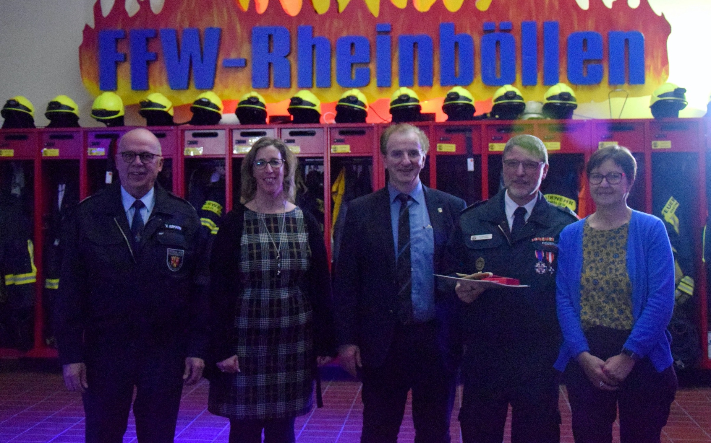 Im Rahmen einer Feierstunde am Montag, 30. Dezember 2019 hat Robert Mertes von der Feuerwehr Rheinböllen für seine Verdienste um das Feuerwehrwesen eine besondere Ehrung von Seiten des Deutschen Feuerwehrverbandes erhalten. So überraschte der Beauftragte für die Aufgaben des Bürgermeisters Arno Imig Herrn Mertes mit der Verleihung des Deutschen Feuerwehr-Ehrenkreuz in Silber. Das Ehrenkreuz wird vom Deutschen Feuerwehrverband an Personen verliehen, die hervorragende Leistungen im Feuerwehrwesen erbracht haben. Seit Eintritt in die Feuerwehr vor fast 44 Jahren war Robert Mertes immer mit Herzblut bei der Feuerwehr dabei. Kein Wochenende, kein Feierabend war ihm für die Feuerwehr zu schade und er ist zu jeder Tages- und Nachtzeit einsatzbereit gewesen. Lange Jahre war er Wehrführer der Feuerwehr Rheinböllen und hat diese Aufgaben nun am 30. Dezember an jüngere Hände, an Hauptbrandmeister Sven Behr, übergeben. Zum 1. Stellvertreter von Sven Behr wurde Christian Zahn und als 2. stellvertretenden Wehrführer Sandy Spengler ernannt.