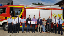 Beauftragter Arno Imig verleiht im feierlichen Rahmen die Förderschilder "Partner der Feuerwehr" an die heimischen Firmen Hahn Automation GmbH und Blitzschutztechnik Lachenmaier.