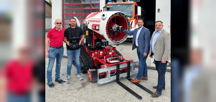 Offiziell heißt das Gerät Löschunterstützungsfahrzeug TAF60. Wehrleiter Arnd Lenarz führte Bürgermeister Thomas Przybylla den jüngsten technischen Neuzugang der VG-Feuerwehr gemeinsam mit seinem Stellvertreter Marco Ihrlich und dem Wehrführer der Feuerwehreinheit Weißenthurm, Torsten Schnack, bei einem Besuch am Weißenthurmer Gerätehaus vor. Der Löschroboter, der speziell für Einsätze in schwer zugänglichen oder gefährlichen Bereichen ausgelegt ist, kann Brände gezielt bekämpfen, ohne Einsatzkräfte zu gefährden. „Dank leistungsstarker Sensoren, einem Kamerasystem inklusive Wärmebildkamera mit drahtloser Übertragung der Bilder und mit Hilfe der ferngesteuerten Bedienung kann sich das Gerät eigenständig durch verqualmte Räume bewegen und Feuer effizient eindämmen“, erklärte Schnack, für den der Roboter eine „perfekte Ergänzung“ der bisherigen Ausrüstung ist. „Vor allem bei Bränden in Industrieanlagen oder bei Gefahrenstoffen wird er uns eine wertvolle Hilfe sein“, sagte der Wehrführer. Denn die robuste Löschraupe kann ebenso auf Straßen wie auf Gleisanlagen eingesetzt werden, unterstützt Bergungsarbeiten und das Entfernen von Hindernissen und verfügt über ein Belüftungssystem zur Entrauchung von Gebäuden, Industriehallen oder Tiefgaragen. „Diese Technologie ist ein weiterer, großer Fortschritt für unsere freiwillige Feuerwehr“, erklärte Przybylla, den die technischen Möglichkeiten des smarten Geräts begeisterten. Der Bürgermeister wies darauf hin, dass die Sicherheit der ehrenamtlichen Feuerwehrleute an oberster Stelle stehe: „Mit diesem Löschroboter haben wir eine zusätzliche Möglichkeit, gefährliche Situationen zu bewältigen“, betonte er. Gleichzeitig dankte der Verwaltungschef dem VG-Rat, der der Anschaffung des modernen Löschunterstützungsfahrzeugs im vergangenen Jahr zugestimmt hatte. „Mit diesem innovativen Gerät zeigt die Verbandsgemeinde Weißenthurm, wie neueste Technologie die Arbeit der Feuerwehrkameradinnen und -kameraden sinnvoll unterstützen kann und setzt ein Zeichen für modernen Bevölkerungsschutz“, bekräftigte Przybylla.